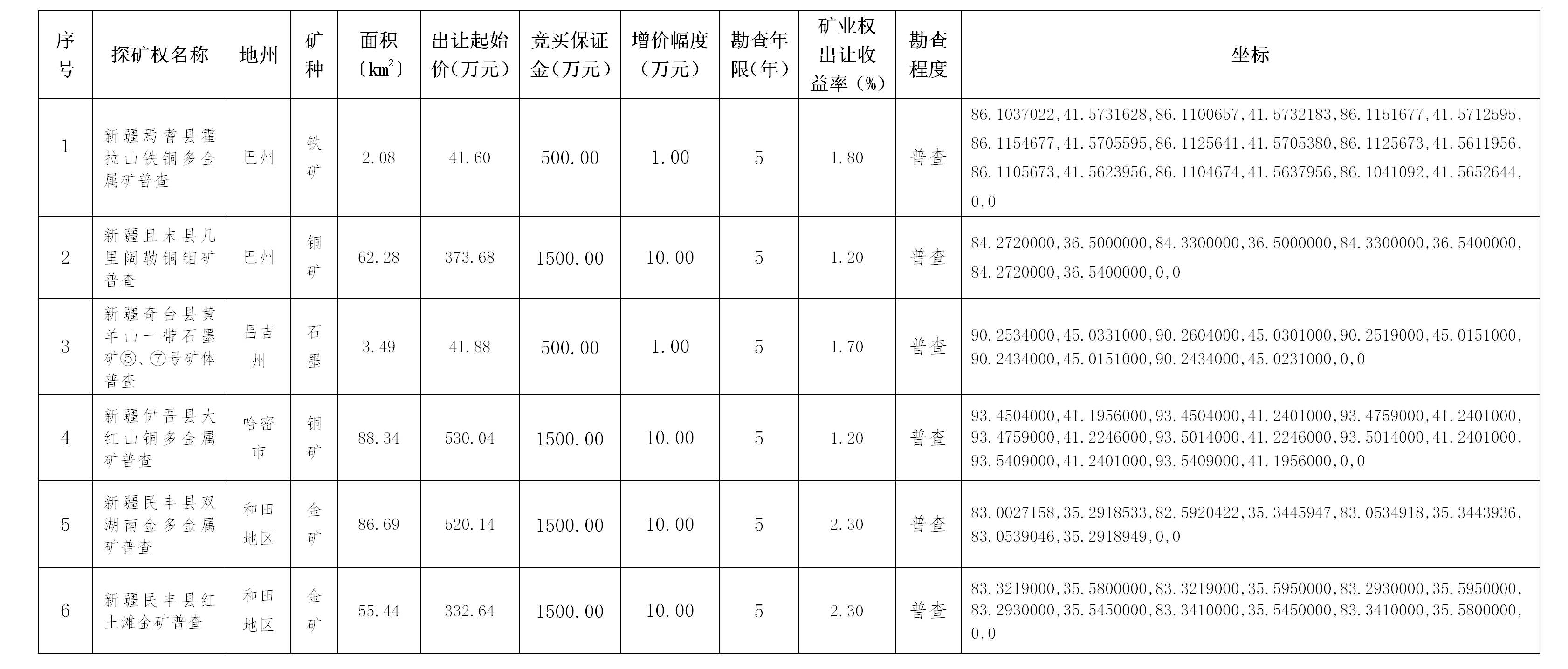 出讓探礦權(quán)名稱、面積、拐點(diǎn)坐標(biāo)、掛牌起始價(jià)、增價(jià)幅度等基本情況(見(jiàn)附件1)。
