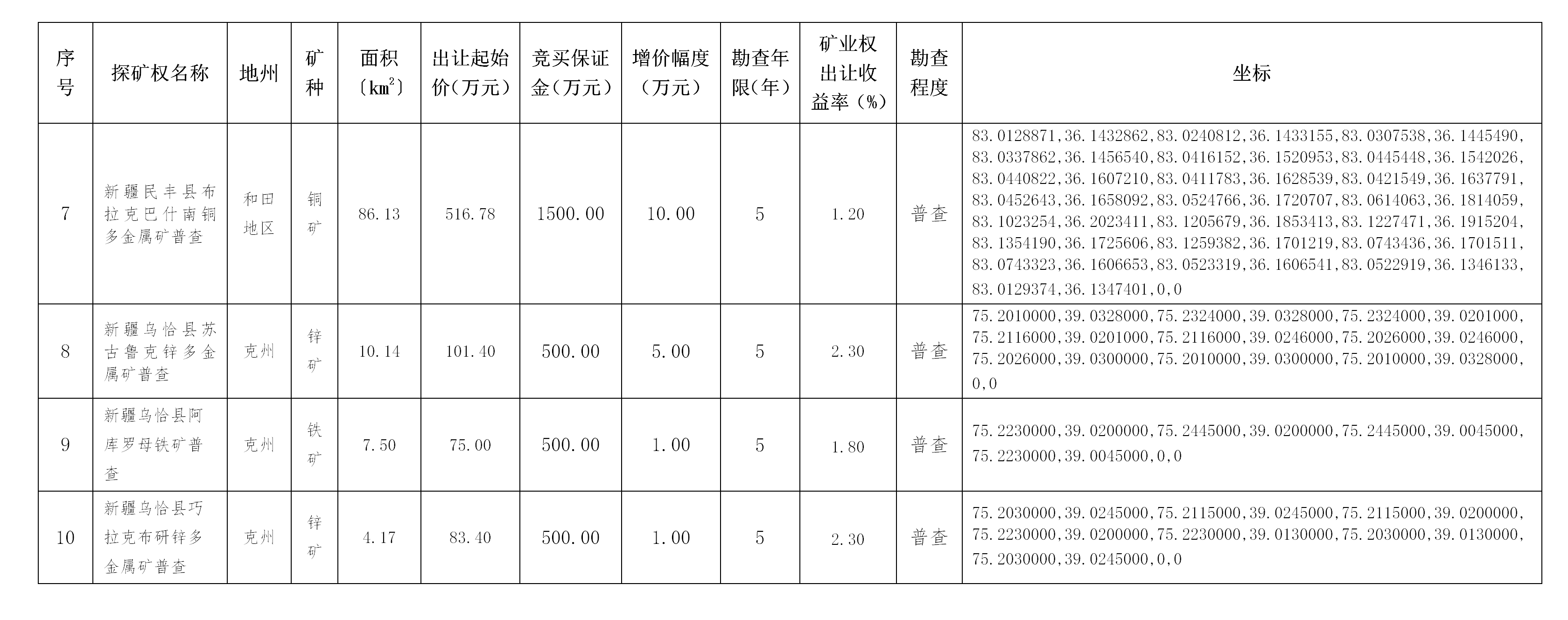 為促進(jìn)礦產(chǎn)資源勘查開(kāi)采,按照相關(guān)法律法規(guī)的規(guī)定,經(jīng)自治區(qū)人民政府批準(zhǔn),受自治區(qū)自然資源廳委托,新疆維吾爾自治區(qū)政務(wù)服務(wù)和公共資源交易中心(以下簡(jiǎn)稱交易中心)以掛牌方式出讓新疆焉耆縣霍拉山鐵銅多金屬礦普查等10個(gè)探礦權(quán)。現(xiàn)將有關(guān)事項(xiàng)公告如下: