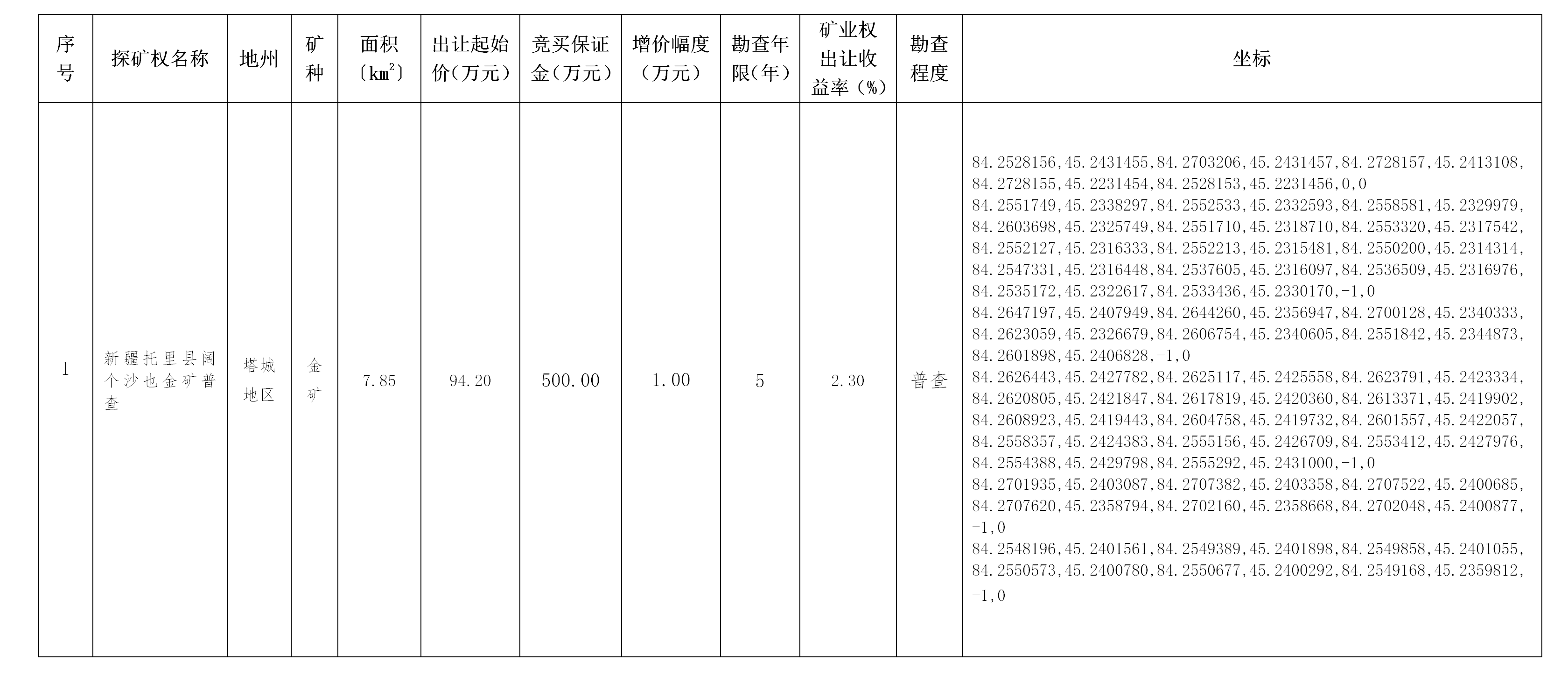 為促進(jìn)礦產(chǎn)資源勘查開采,按照相關(guān)法律法規(guī)的規(guī)定,經(jīng)自治區(qū)人民政府批準(zhǔn),受自治區(qū)自然資源廳委托,新疆維吾爾自治區(qū)政務(wù)服務(wù)和公共資源交易中心(以下簡(jiǎn)稱交易中心)以掛牌方式出讓新疆托里縣闊個(gè)沙也金礦普查等7個(gè)探礦權(quán)。現(xiàn)將有關(guān)事項(xiàng)公告如下: