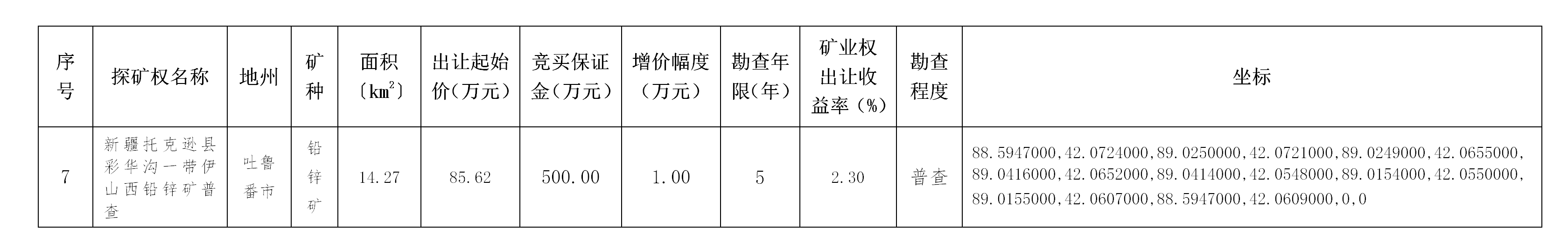 出讓探礦權(quán)名稱、面積、拐點(diǎn)坐標(biāo)、掛牌起始價(jià)、增價(jià)幅度等基本情況(見附件1)。
