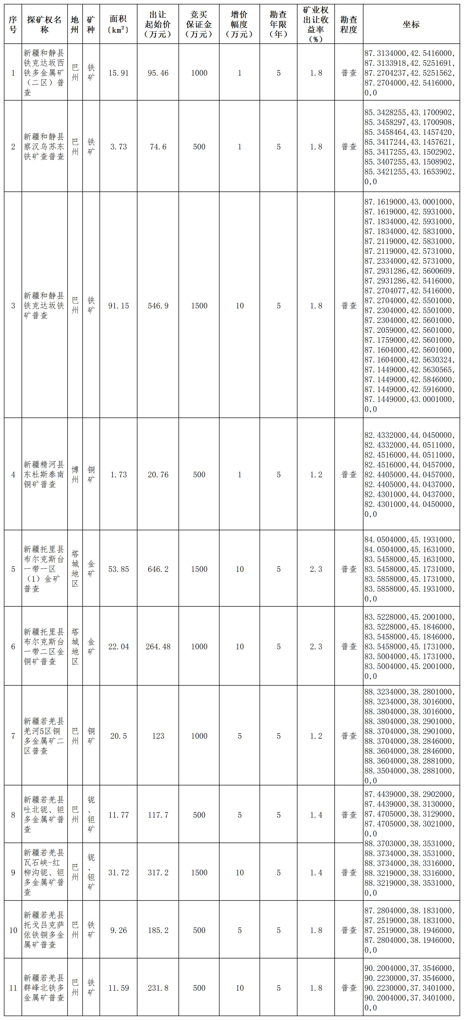 為促進(jìn)礦產(chǎn)資源勘查開(kāi)采,按照相關(guān)法律法規(guī)的規(guī)定,經(jīng)自治區(qū)人民政府批準(zhǔn),受自治區(qū)自然資源廳委托,新疆維吾爾自治區(qū)政務(wù)服務(wù)和公共資源交易中心(以下簡(jiǎn)稱交易中心)以掛牌方式出讓新疆和靜縣鐵克達(dá)坂西鐵多金屬礦(二區(qū))普查等11個(gè)探礦權(quán)。現(xiàn)將有關(guān)事項(xiàng)公告如下: