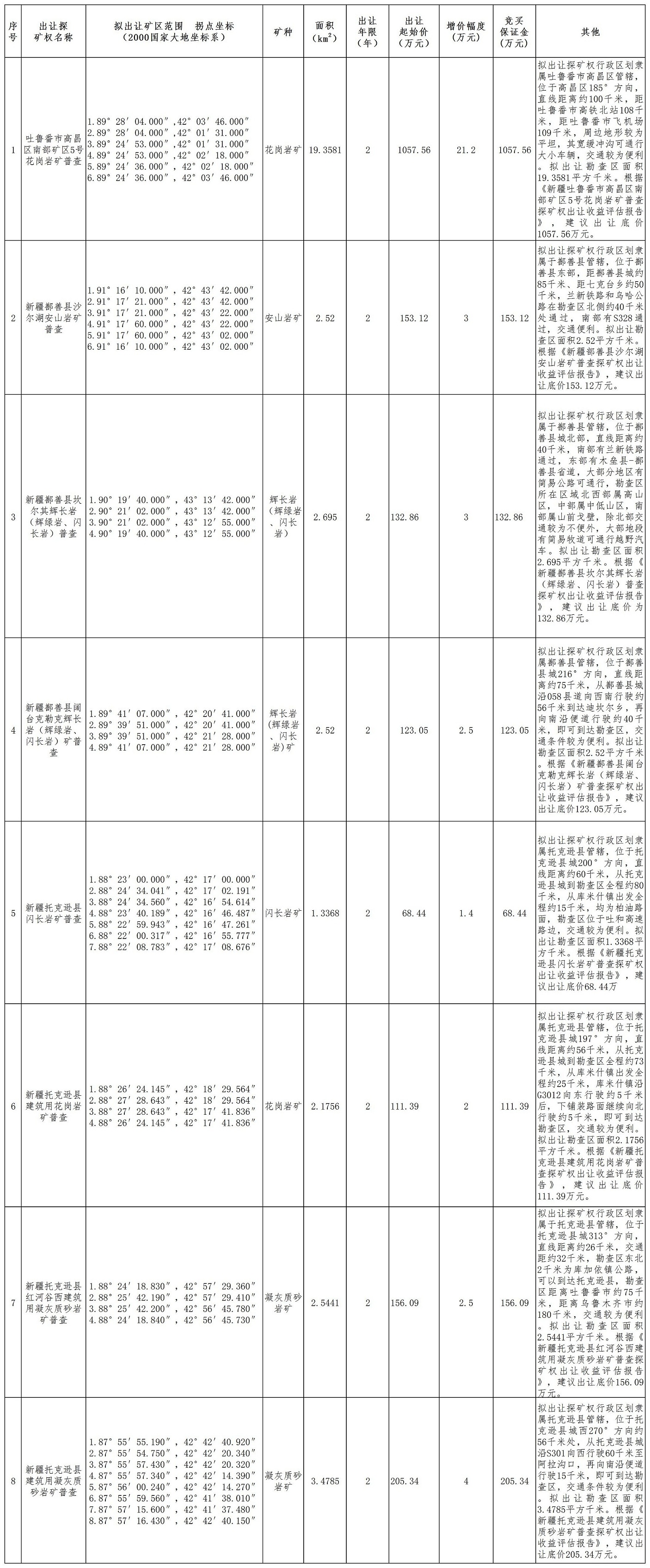 為深化礦產(chǎn)資源有償使用制度,培育和建立規(guī)范、開放、競(jìng)爭(zhēng)、有序的礦業(yè)權(quán)市場(chǎng),促進(jìn)礦產(chǎn)資源有序開發(fā),根據(jù)《中華人民共和國(guó)礦產(chǎn)資源法》、《礦業(yè)權(quán)出讓交易規(guī)則》(自然資規(guī)〔2023〕1號(hào))、《關(guān)于印發(fā)〈新疆維吾爾自治區(qū)礦產(chǎn)資源管理若干事項(xiàng)暫行辦法〉的通知》(新自然資規(guī)〔2021〕1號(hào)),經(jīng)吐魯番市人民政府批準(zhǔn),吐魯番市自然資源局委托吐魯番市建正建設(shè)工程交易有限公司(以下簡(jiǎn)稱“建正公司”)以掛牌方式出讓新疆鄯善縣沙爾湖安山巖礦普查等8個(gè)探礦權(quán)。現(xiàn)將有關(guān)事項(xiàng)公告如下: