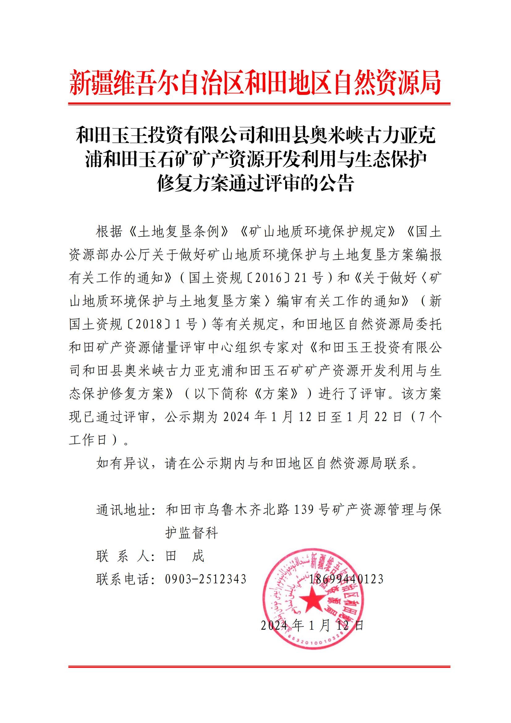 和田玉王投資有限公司和田縣奧米峽古力亞克浦和田玉石礦礦產(chǎn)資源開(kāi)發(fā)利用與生態(tài)保護(hù)修復(fù)方案通過(guò)評(píng)審的公告