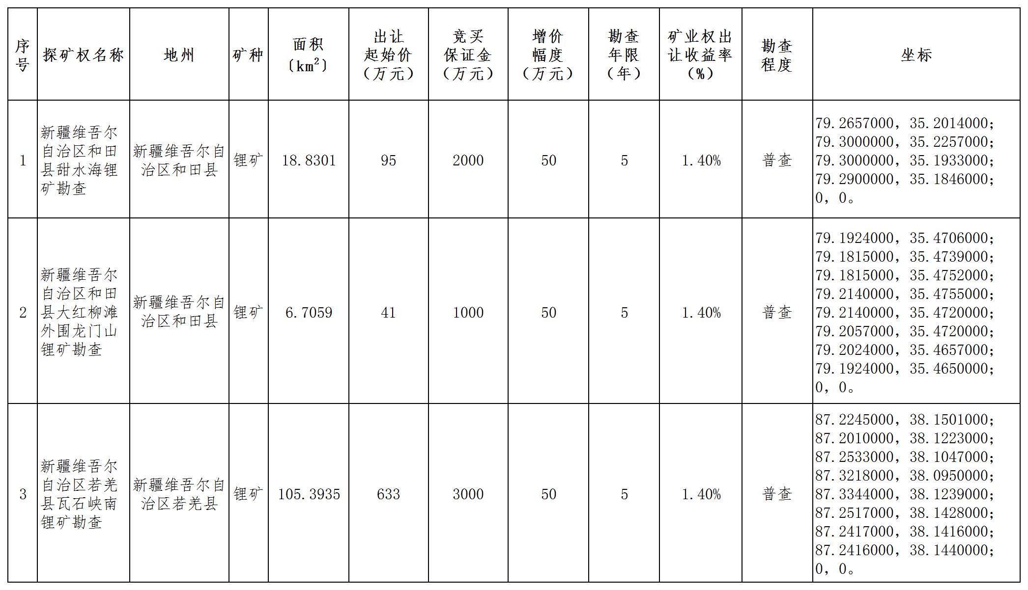 為促進(jìn)礦產(chǎn)資源勘查開采,按照相關(guān)法律法規(guī)規(guī)定,自然資源部組織新疆維吾爾自治區(qū)自然資源廳實(shí)施新疆維吾爾自治區(qū)和田縣甜水海鋰礦勘查等3宗鋰礦探礦權(quán)掛牌出讓。