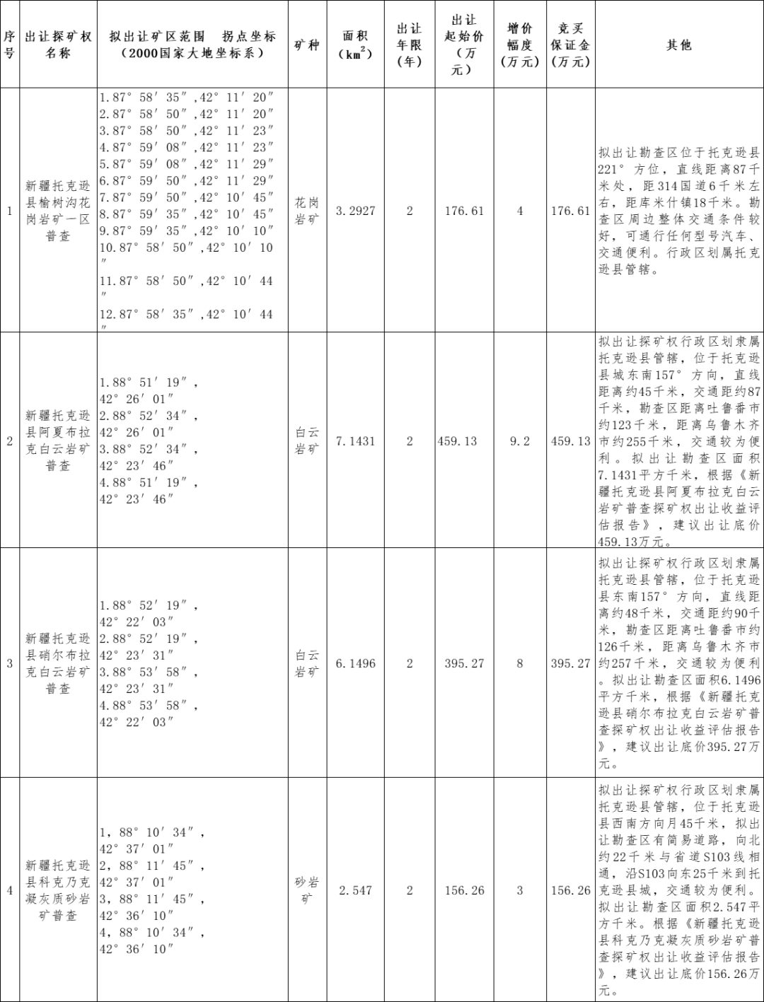 為深化礦產(chǎn)資源有償使用制度,培育和建立規(guī)范、開放、競(jìng)爭(zhēng)、有序的礦業(yè)權(quán)市場(chǎng),促進(jìn)礦產(chǎn)資源有序開發(fā),根據(jù)《中華人民共和國(guó)礦產(chǎn)資源法》、《礦業(yè)權(quán)出讓交易規(guī)則》(自然資規(guī)〔2023〕1號(hào))、《關(guān)于印發(fā)〈新疆維吾爾自治區(qū)礦產(chǎn)資源管理若干事項(xiàng)暫行辦法〉的通知》(新自然資規(guī)〔2021〕1號(hào)),經(jīng)吐魯番市人民政府批準(zhǔn),吐魯番市自然資源局委托吐魯番市建正建設(shè)工程交易有限公司(以下簡(jiǎn)稱“建正公司”)以掛牌方式出讓新疆托克遜縣科克乃克凝灰質(zhì)砂巖礦普查等4個(gè)探礦權(quán)?,F(xiàn)將有關(guān)事項(xiàng)公告如下: