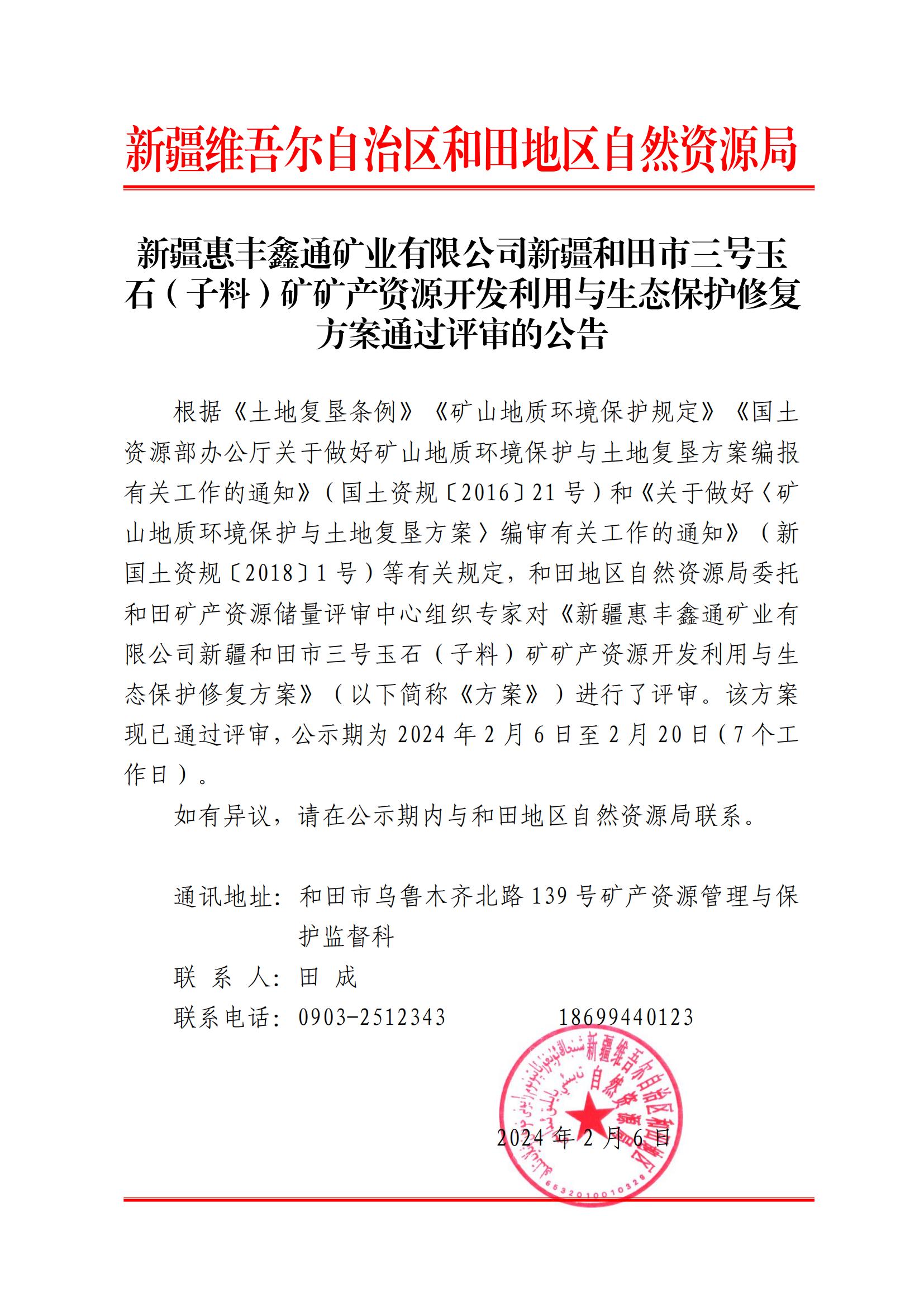 新疆惠豐鑫通礦業(yè)有限公司新疆和田市三號玉 石(子料)礦礦產(chǎn)資源開發(fā)利用與生態(tài)保護修復(fù)方案通過評審的公告