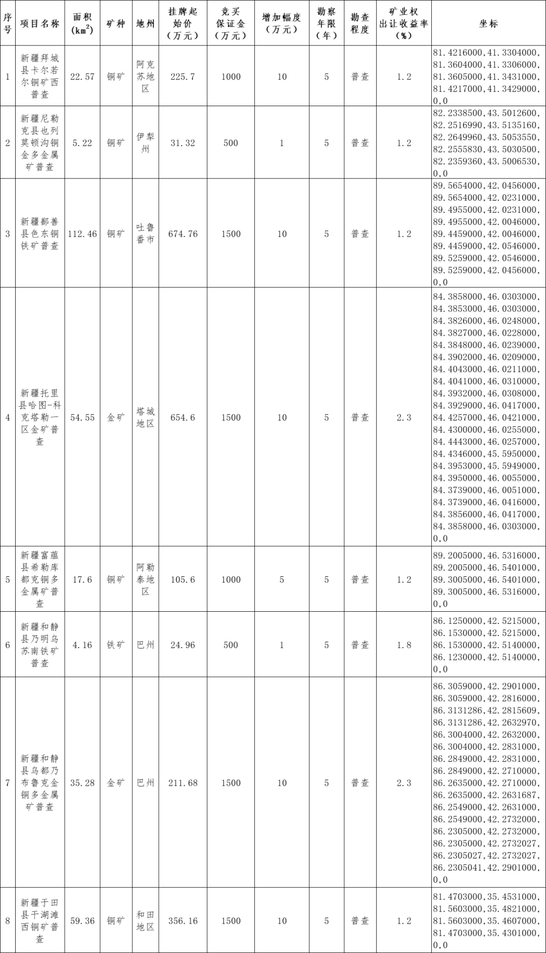 為促進礦產(chǎn)資源勘查開采,按照相關(guān)法律法規(guī)的規(guī)定,經(jīng)自治區(qū)人民政府批準,受自治區(qū)自然資源廳委托,新疆維吾爾自治區(qū)政務服務和公共資源交易中心(以下簡稱交易中心)以掛牌方式出讓新疆拜城縣卡爾若爾銅礦西普查等8個探礦權(quán)?,F(xiàn)將有關(guān)事項公告如下: