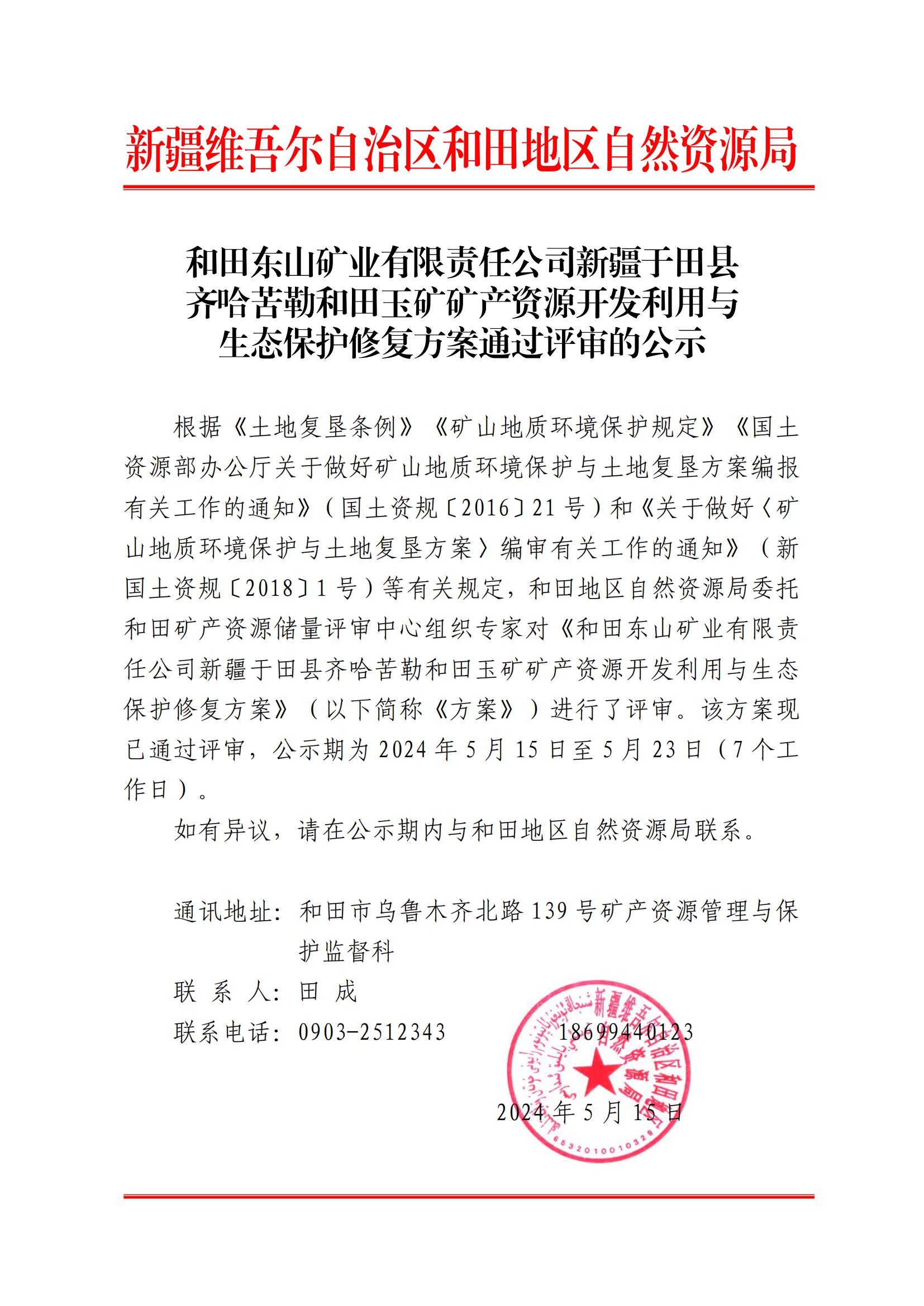 和田東山礦業(yè)有限責任公司新疆于田縣齊哈苦勒和田玉礦礦產(chǎn)資源開發(fā)利用與生態(tài)保護修復方案通過評審的公示