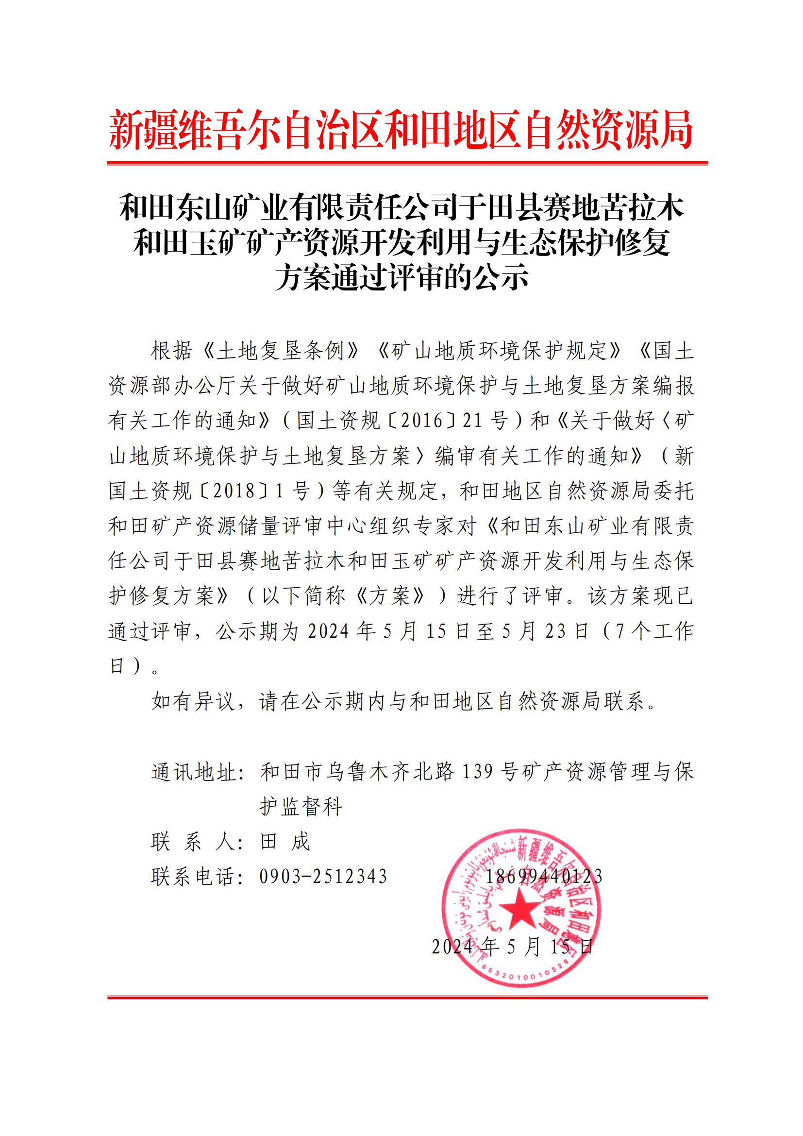 和田東山礦業(yè)有限責(zé)任公司于田縣賽地苦拉木和田玉礦礦產(chǎn)資源開發(fā)利用與生態(tài)保護(hù)修復(fù)方案通過評審的公示
