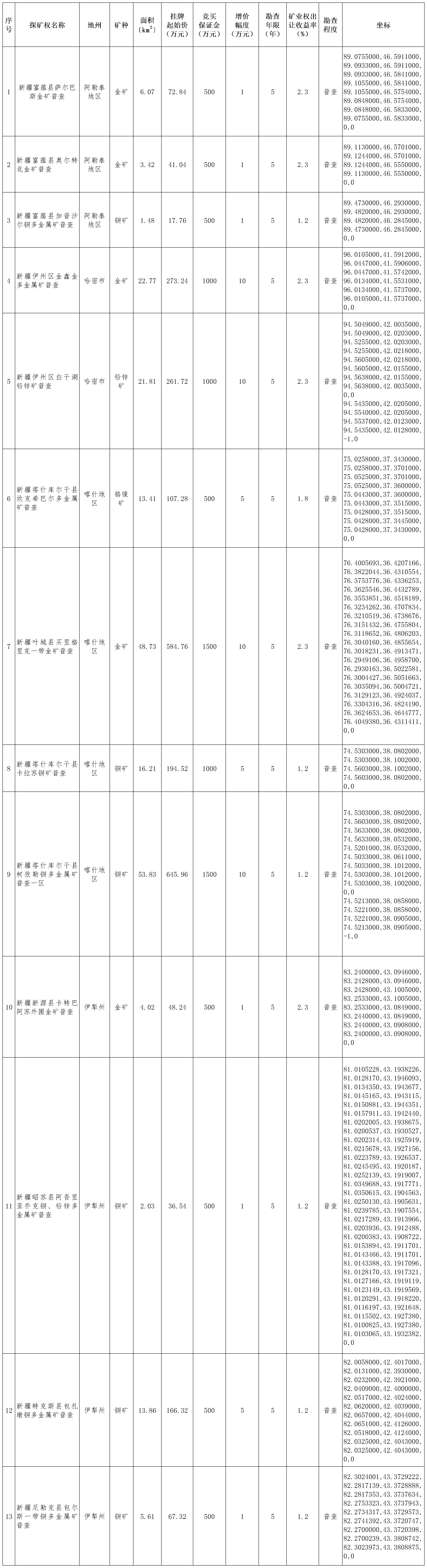 出讓探礦權(quán)名稱、面積、拐點(diǎn)坐標(biāo)、掛牌起始價(jià)、礦業(yè)權(quán)出讓收益率、增價(jià)幅度等基本情況(見附件1)。
