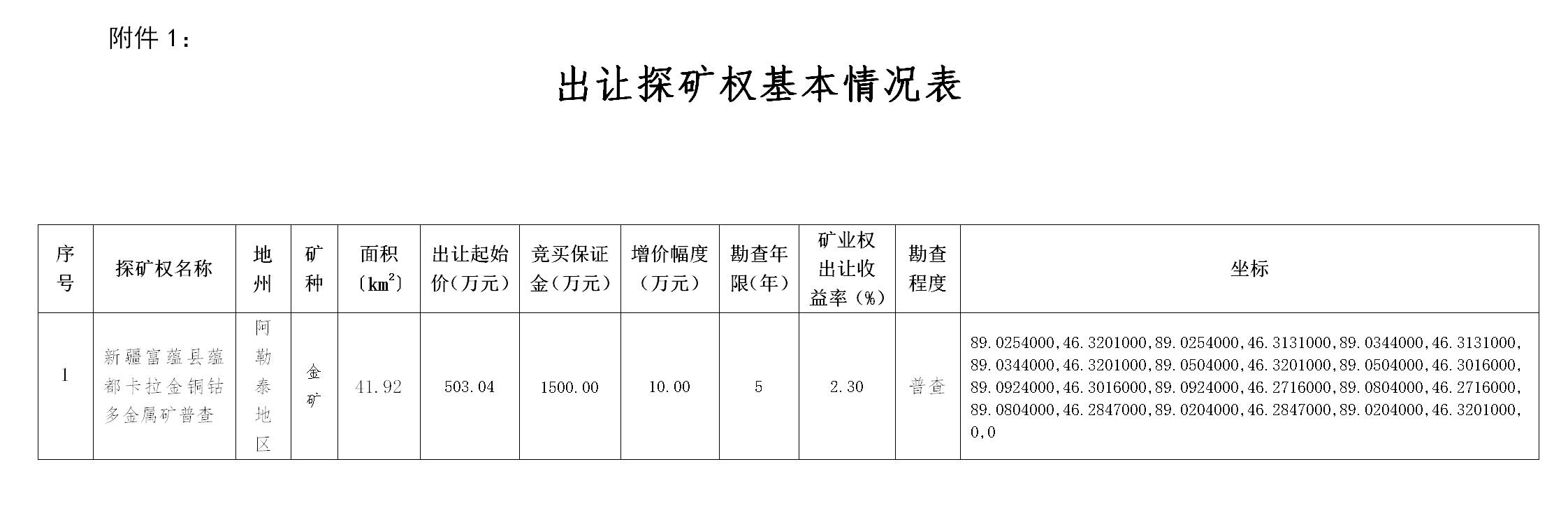 出讓探礦權名稱、面積、拐點坐標、掛牌起始價、增價幅度等基本情況(見附件1)。