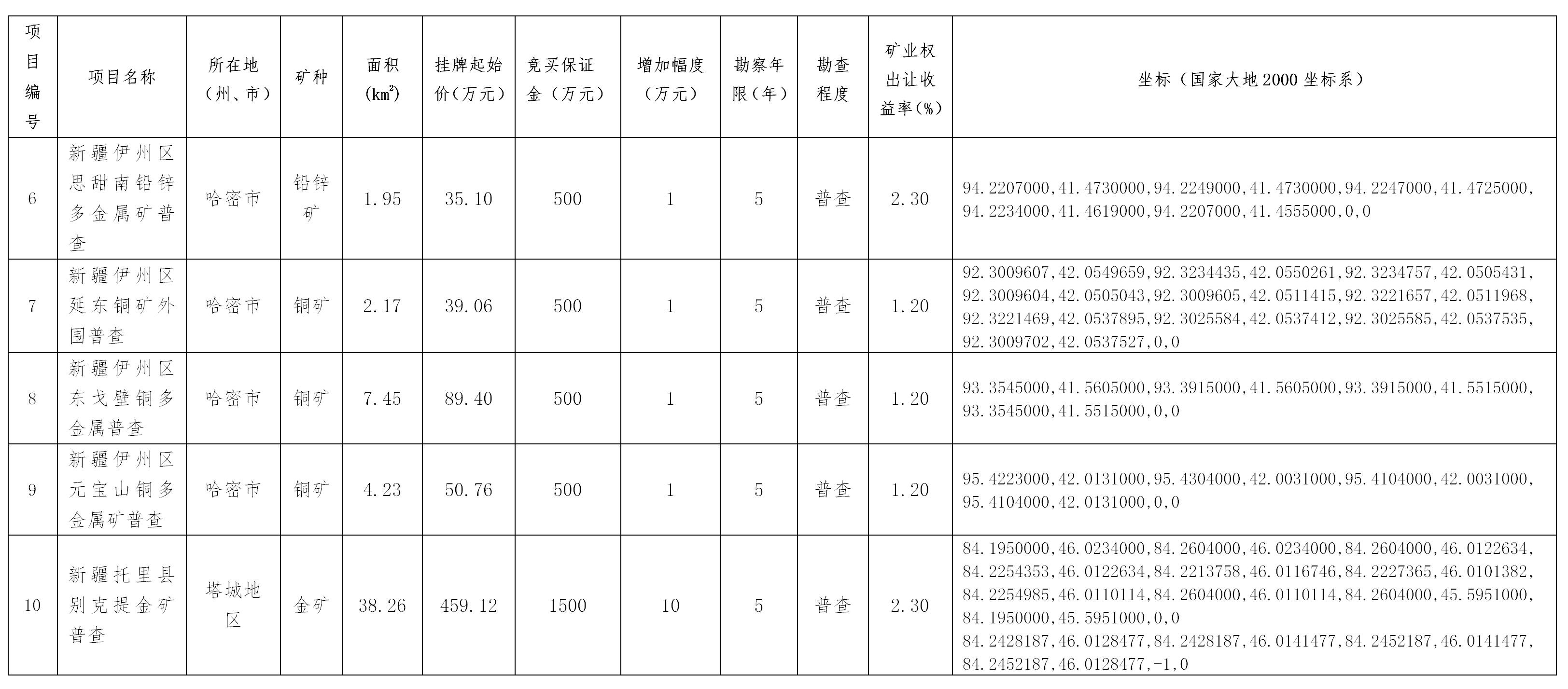 出讓探礦權(quán)名稱、面積、拐點(diǎn)坐標(biāo)、掛牌起始價(jià)、礦業(yè)權(quán)出讓收益率、增價(jià)幅度等基本情況(見(jiàn)附件1)。