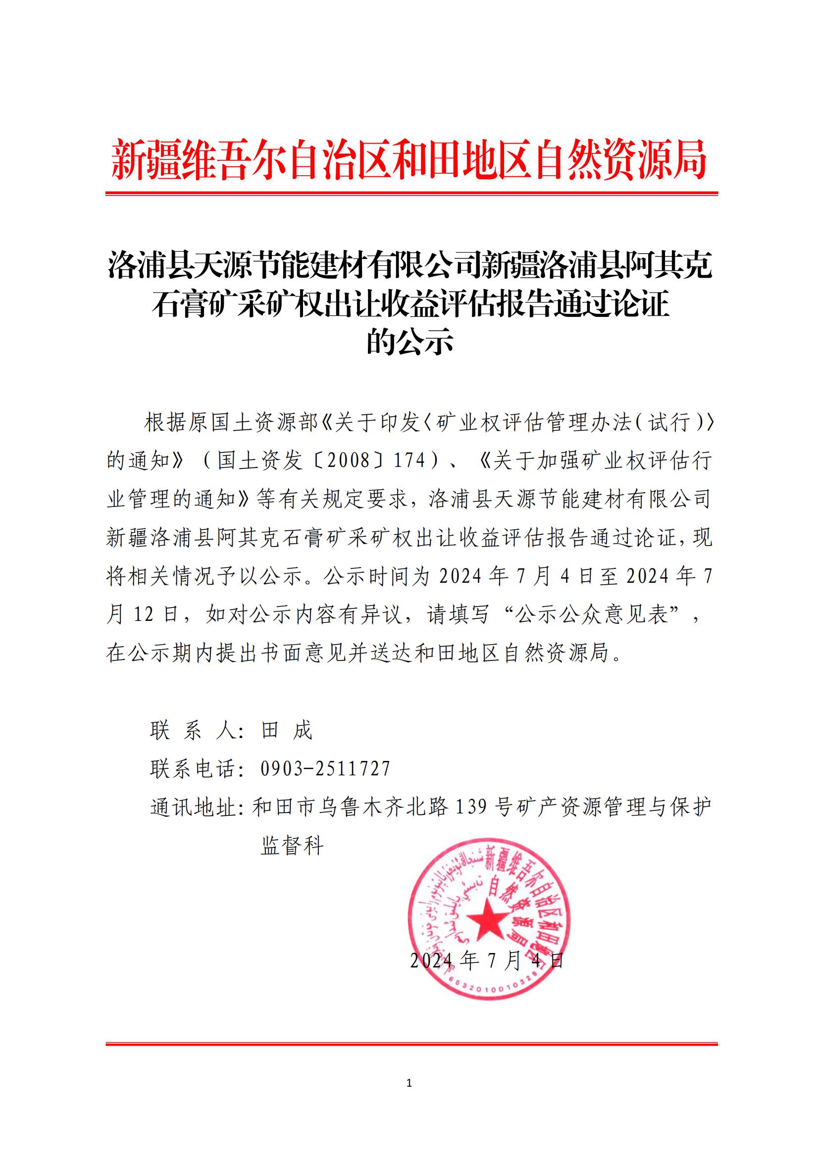 洛浦縣天源節(jié)能建材有限公司新疆洛浦縣阿其克石膏礦采礦權(quán)出讓收益評估報告通過論證的公示
