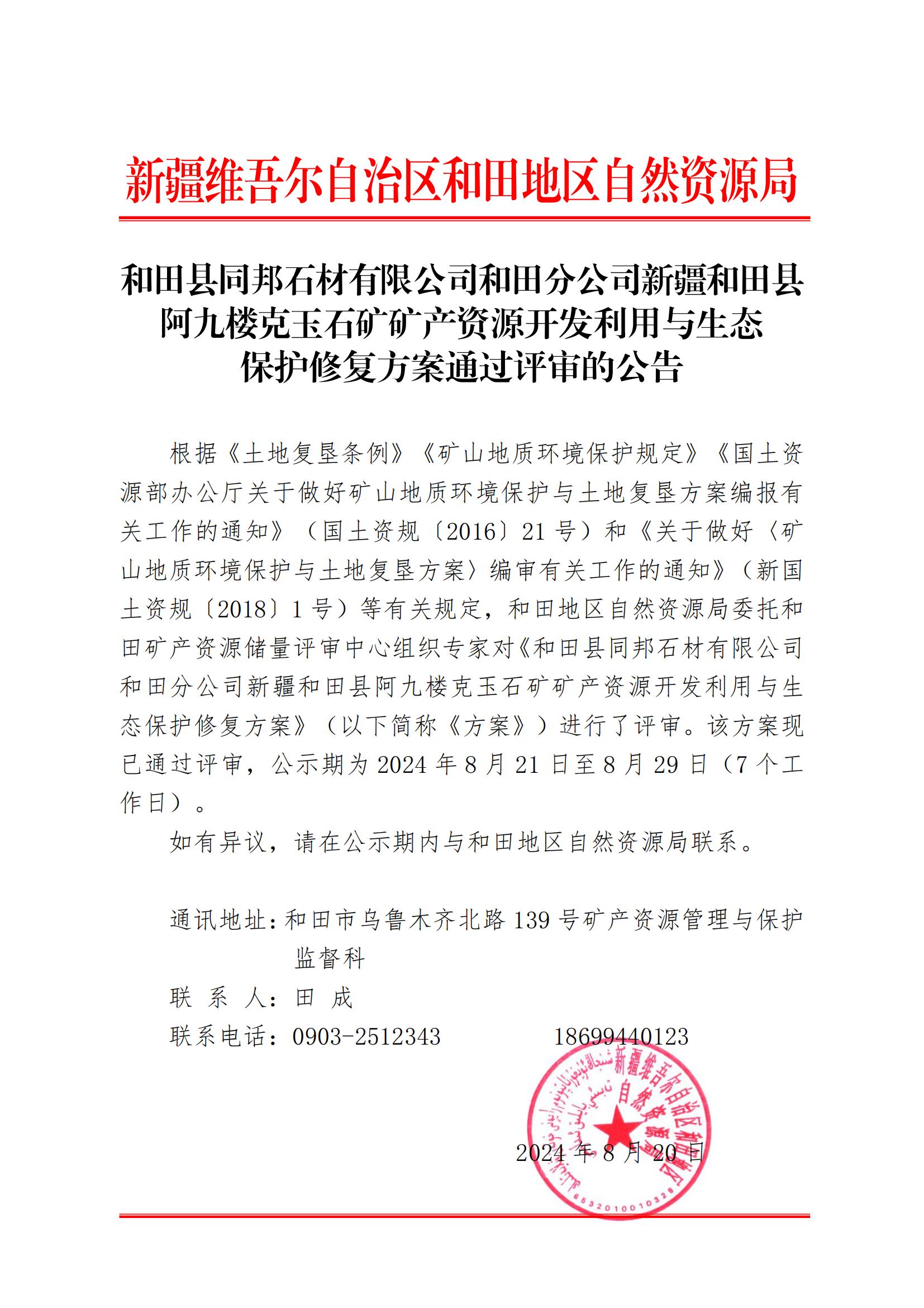 和田縣同邦石材有限公司和田分公司新疆和田縣阿九樓克玉石礦礦產(chǎn)資源開發(fā)利用與生態(tài)保護修復(fù)方案通過評審的公告