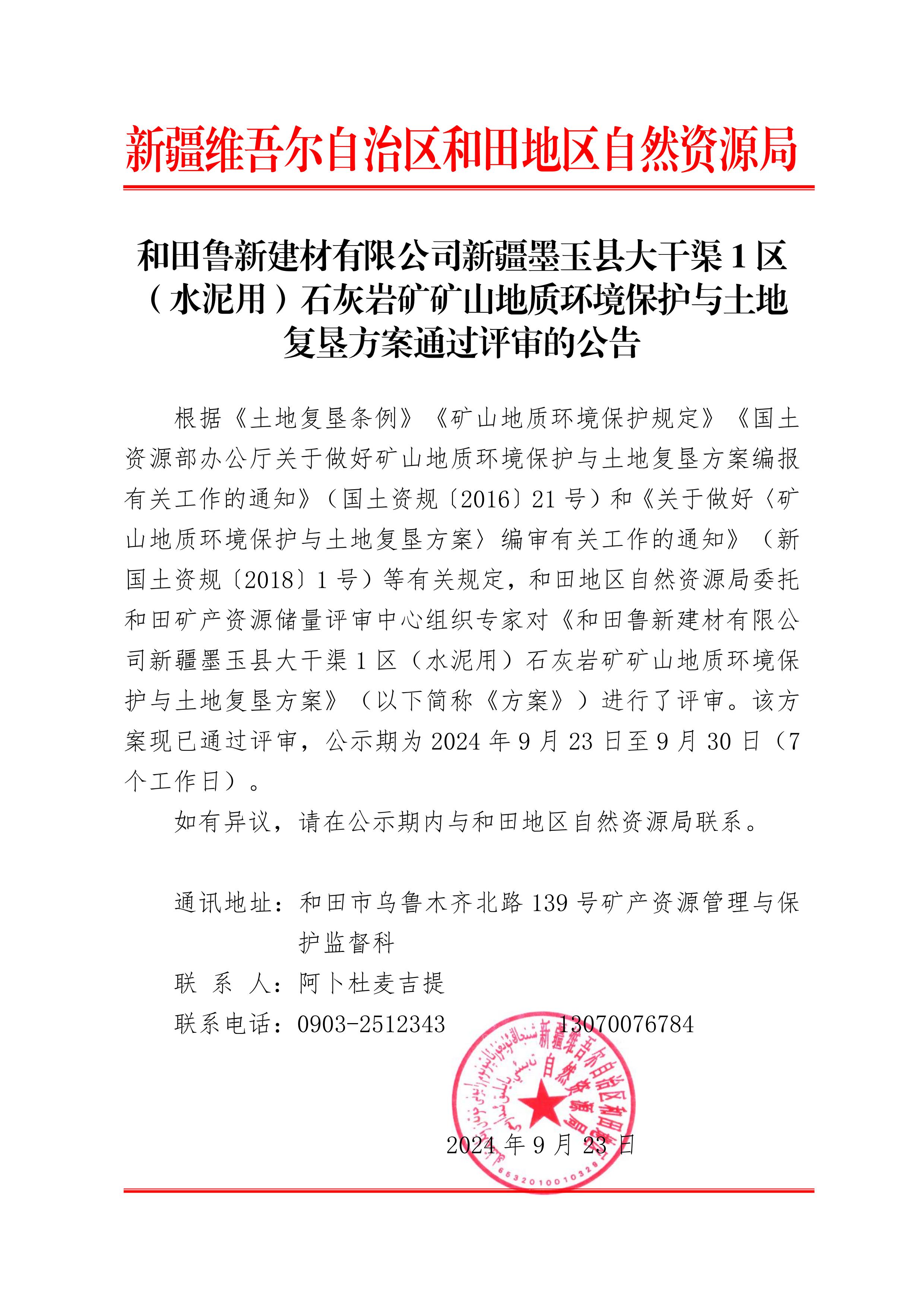和田魯新建材有限公司新疆墨玉縣大干渠1區(qū)(水泥用)石灰?guī)r礦礦山地質(zhì)環(huán)境保護(hù)與土地復(fù)墾方案通過評(píng)審的公告