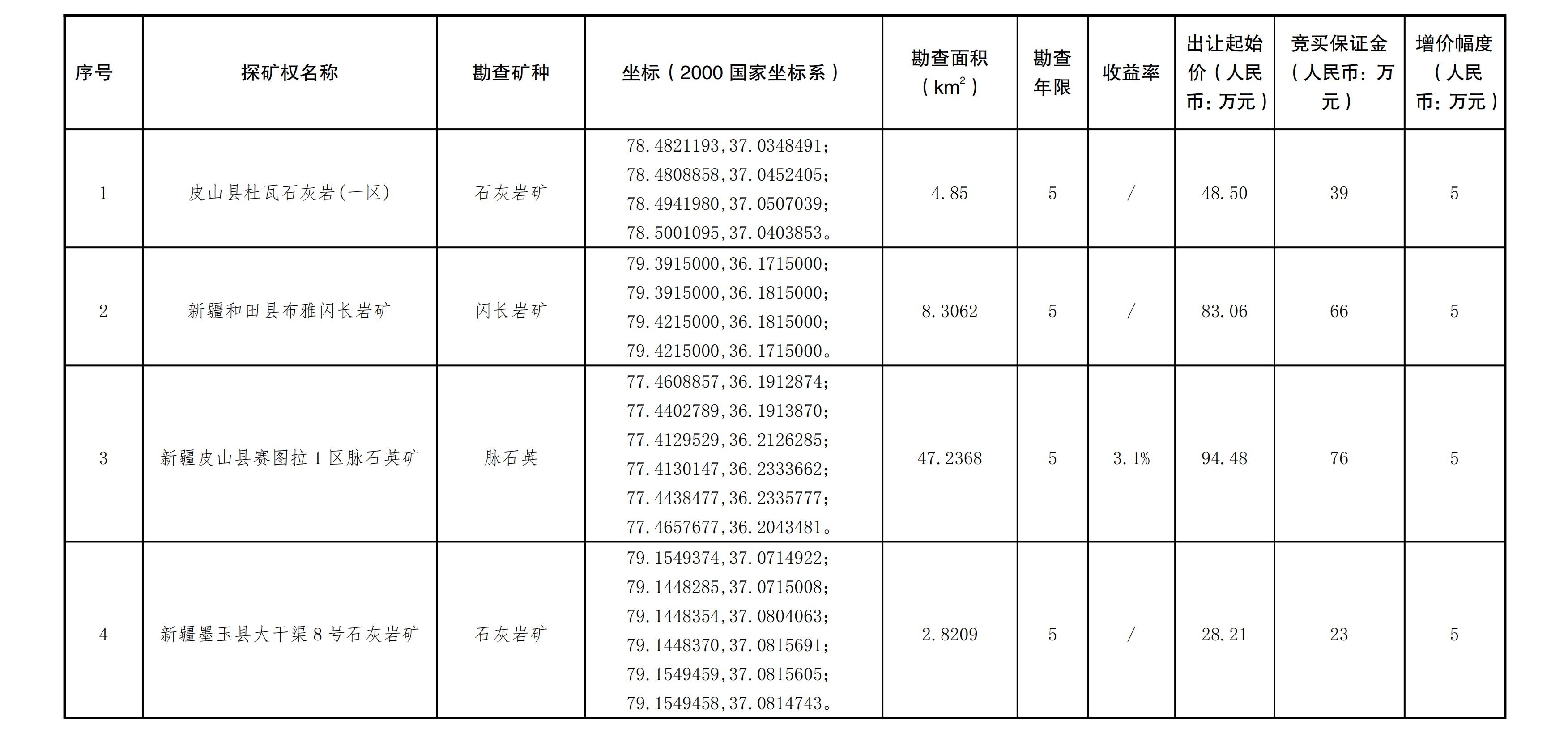 依據(jù)《中華人民共和國(guó)礦產(chǎn)資源法》《中華人民共和國(guó)拍賣法》《礦業(yè)權(quán)出讓交易規(guī)則》(自然資規(guī)〔2023〕1號(hào))《新疆維吾爾自治區(qū)礦產(chǎn)資源管理若干事項(xiàng)暫行辦法》(新自然資規(guī)〔2021〕1號(hào)),以及《國(guó)務(wù)院辦公廳關(guān)于印發(fā)整合建立統(tǒng)一的公共資源交易平臺(tái)工作方案的通知》(國(guó)辦發(fā)〔2015〕63號(hào))等有關(guān)法律法規(guī)和政策規(guī)定,經(jīng)和田地區(qū)資源管理委員會(huì)批準(zhǔn),和田地區(qū)自然資源局對(duì)以下探礦權(quán)以拍賣方式公開(kāi)出讓,現(xiàn)將有關(guān)事宜公告如下: