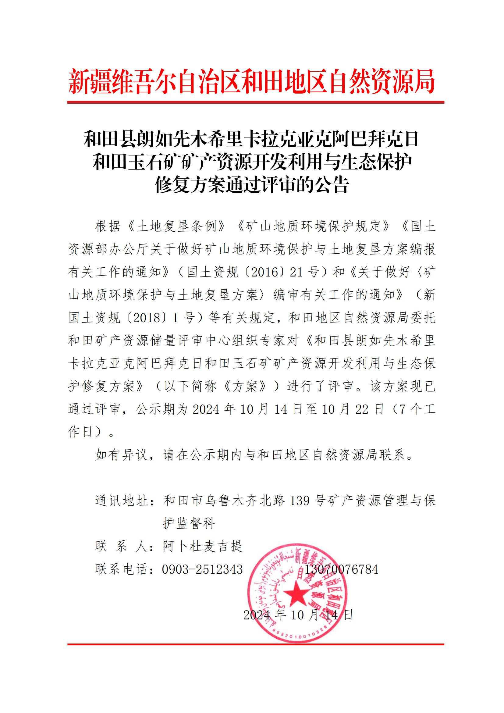 和田縣朗如先木希里卡拉克亞克阿巴拜克日和田玉石礦礦產(chǎn)資源開發(fā)利用與生態(tài)保護修復方案通過評審的公告