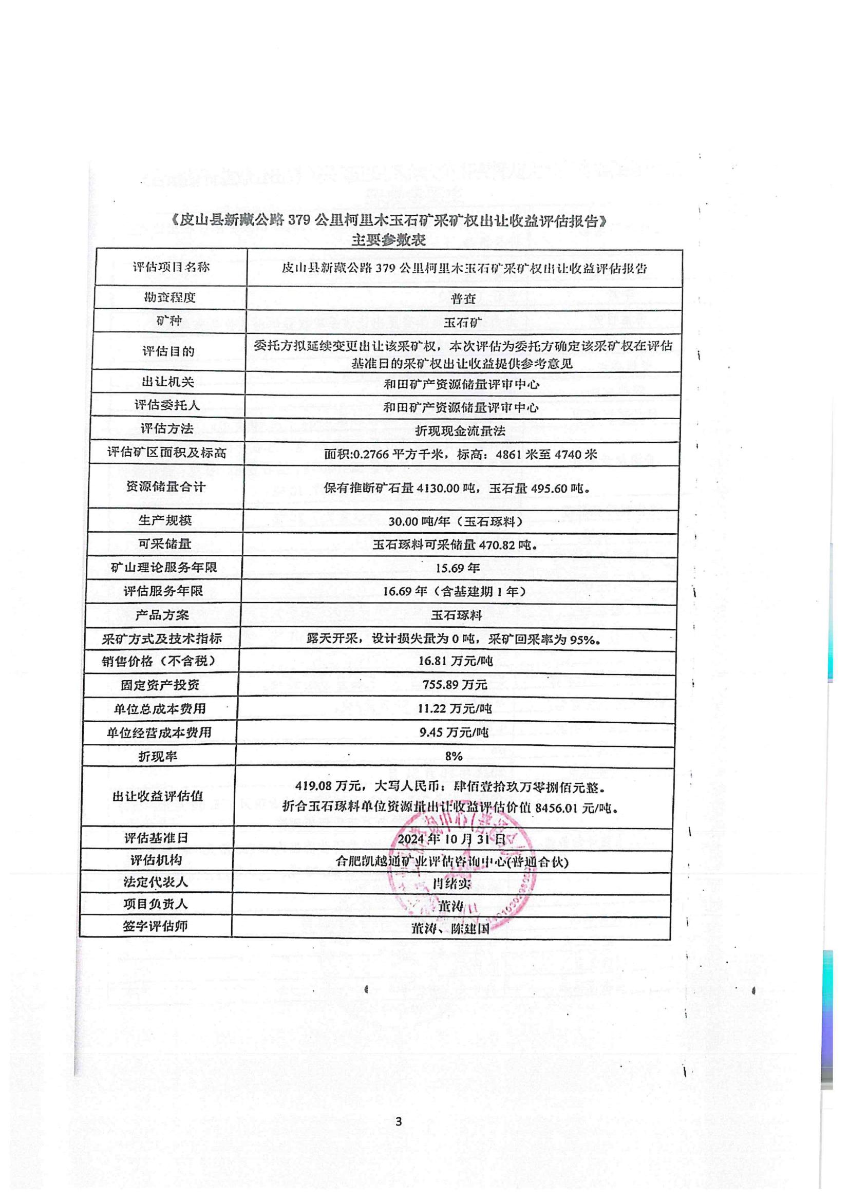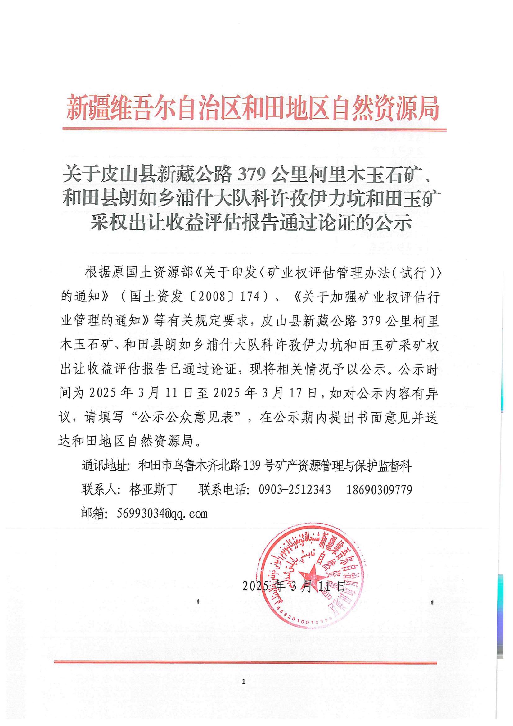 關于皮山縣新藏公路379公里柯里木玉石礦、和田縣朗如鄉(xiāng)浦什大隊科許孜伊力坑和田玉礦采權出讓收益評估報告通過論證的公示