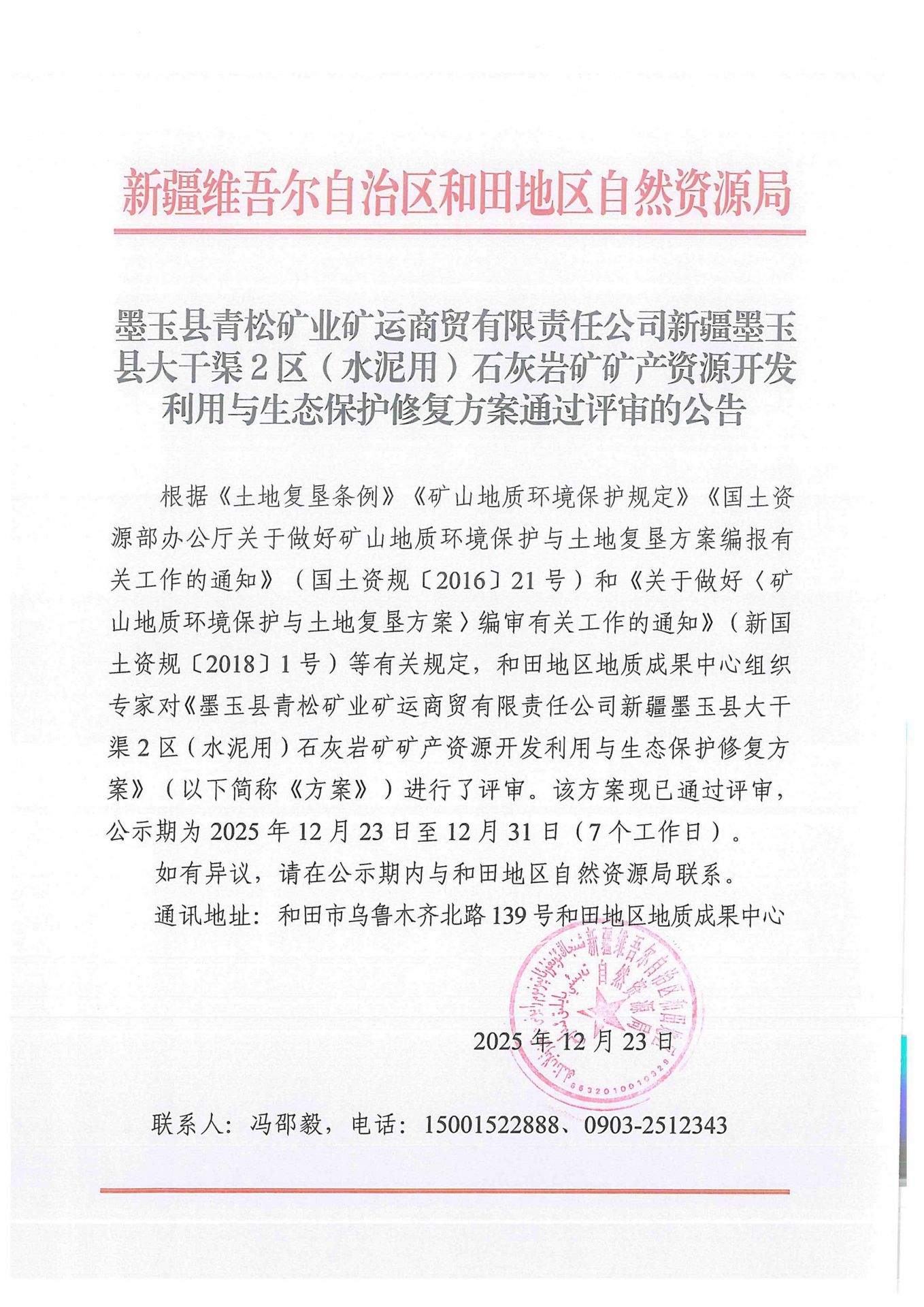 《墨玉縣青松礦業(yè)礦運(yùn)商貿(mào)有限責(zé)任公司新疆墨玉縣大干渠2區(qū)(水泥用)石灰?guī)r礦礦產(chǎn)資源開發(fā)利用與生態(tài)保護(hù)修復(fù)方案》評審公告
