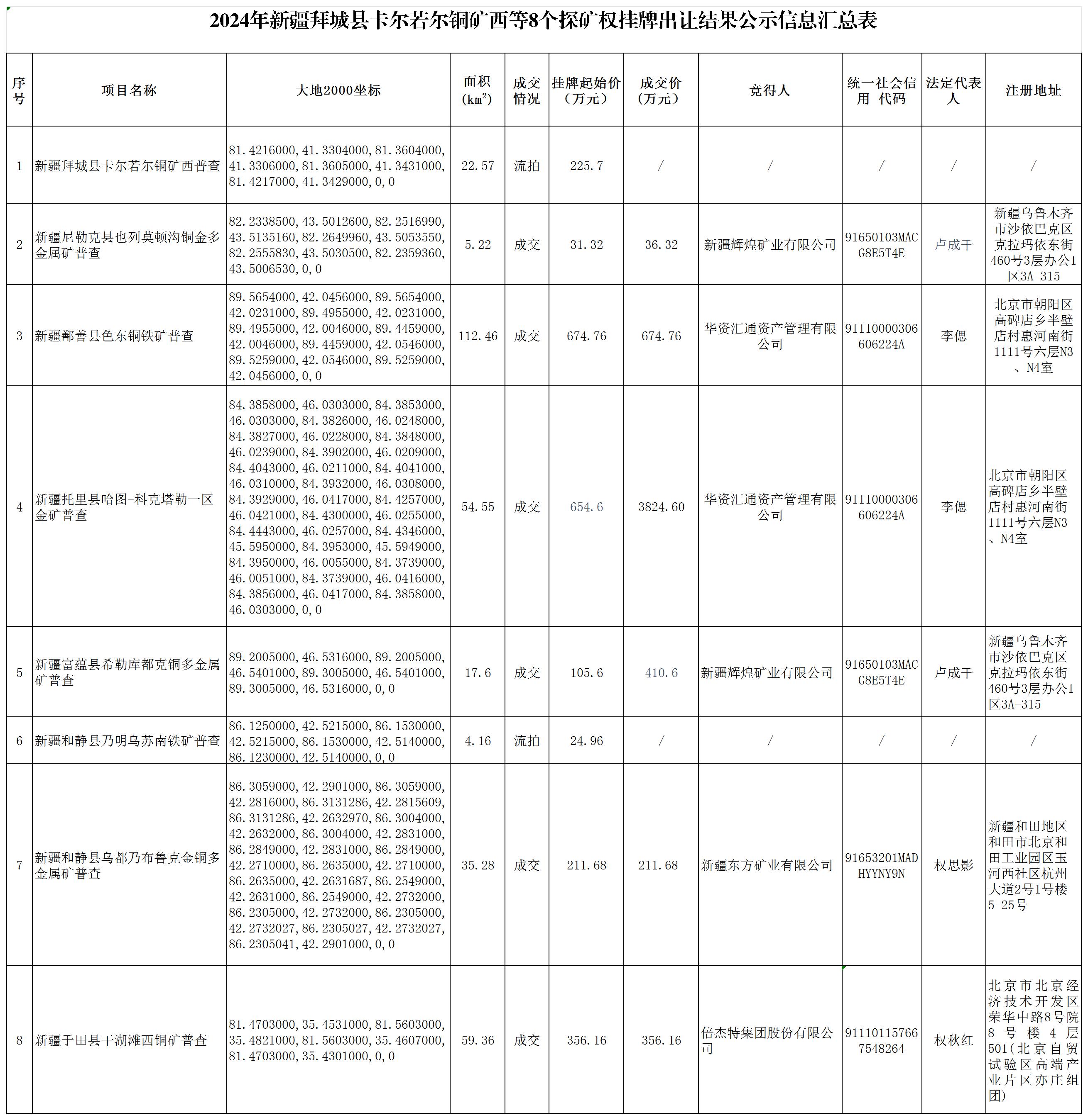 附件:新疆拜城縣卡爾若爾銅礦西普查等8個探礦權掛牌出讓結果公示信息匯總表