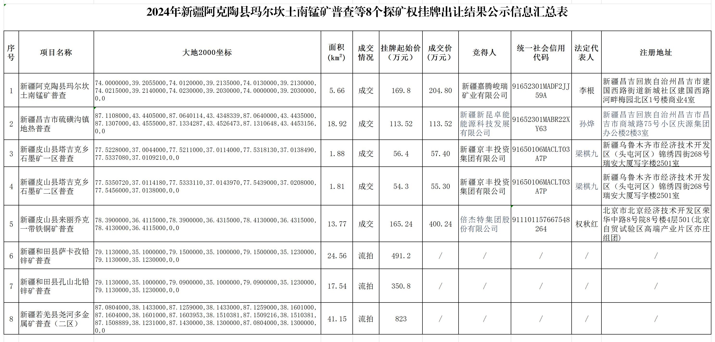 附件:新疆阿克陶縣瑪爾坎土南錳礦普查等8個(gè)探礦權(quán)掛牌出讓結(jié)果公示信息匯總表