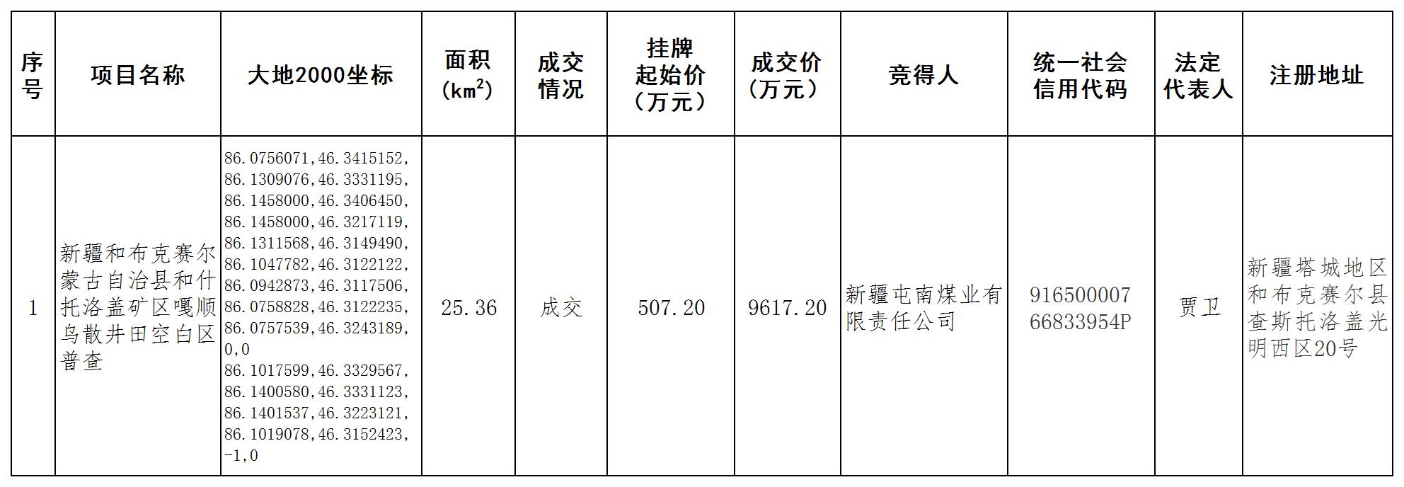 附件:2024年新疆和布克賽爾蒙古自治縣和什托洛蓋礦區(qū)嘎順烏散井田空白區(qū)普查探礦權(quán)掛牌出讓結(jié)果公示信息匯總表