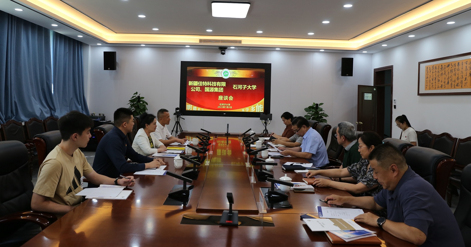 為響應國家政策號召,促進與高校的交流合作,2023年7月3日下午,國源集團黨工委書記、總裁楊 杰、總裁(黨工委)辦主任袁 岳,新疆佳特科技有限公司董事長文 彬等一行赴石河子大學就校企合作事宜進行座談交流。石河子大學黨委常委、副校長童軍茂主持座談會,商學院黨委副書記、院長馮光明,繼續(xù)教育學院黨委書記李 剛,發(fā)展與規(guī)劃處副處長張 燕,教務處副處長李 玲,資產(chǎn)管理處副處長張超,及信息與大數(shù)據(jù)學院、藥學院等相關負責人參加座談。