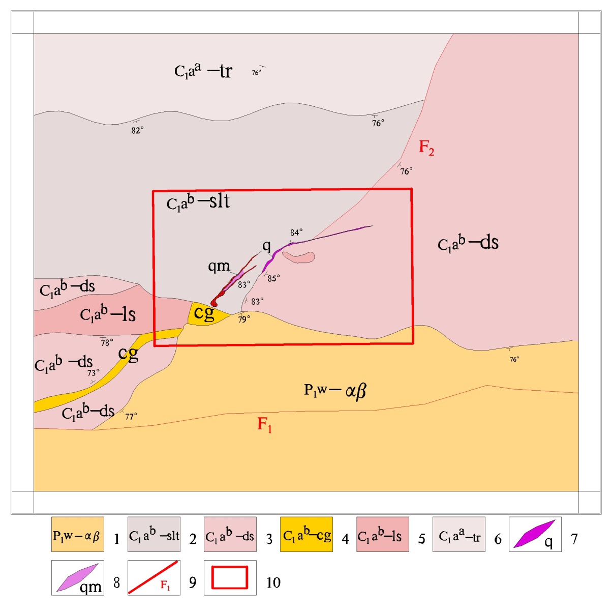 1.下二疊烏郎組安山玄武巖;2.下石炭統(tǒng)阿克沙克組上段粉砂巖;3.下石炭統(tǒng)阿克沙克組上段巖屑砂巖;4.下石炭統(tǒng)阿克沙克組上段礫巖;5.下石炭統(tǒng)阿克沙克組上段灰?guī)r;6.下石炭統(tǒng)阿克沙克組下段含礫凝灰?guī)r;7.石英脈;8.石英網(wǎng)脈;9.斷層位置及編號;10.擬設(shè)采礦權(quán)位置及工作區(qū)范圍;