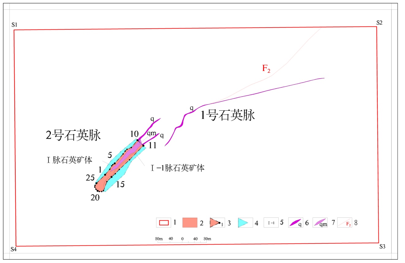 1.礦業(yè)權(quán)范圍;2.礦體位置;3.資源量估算范圍及拐點(diǎn)編號;4.資源量剝離范圍;5.石英脈礦體位置及編號;6.石英脈;7.石英網(wǎng)脈;8.斷層位置及編號