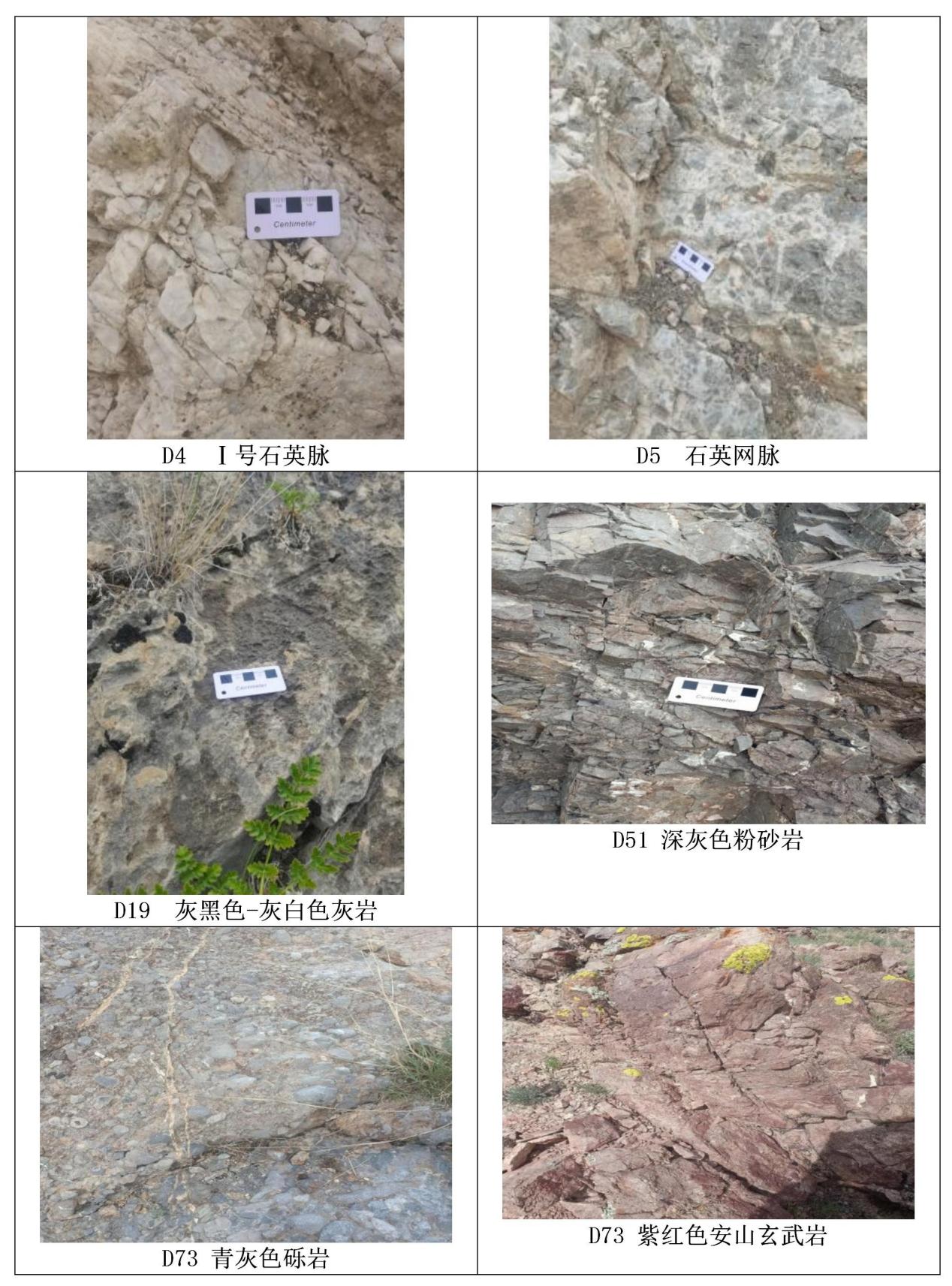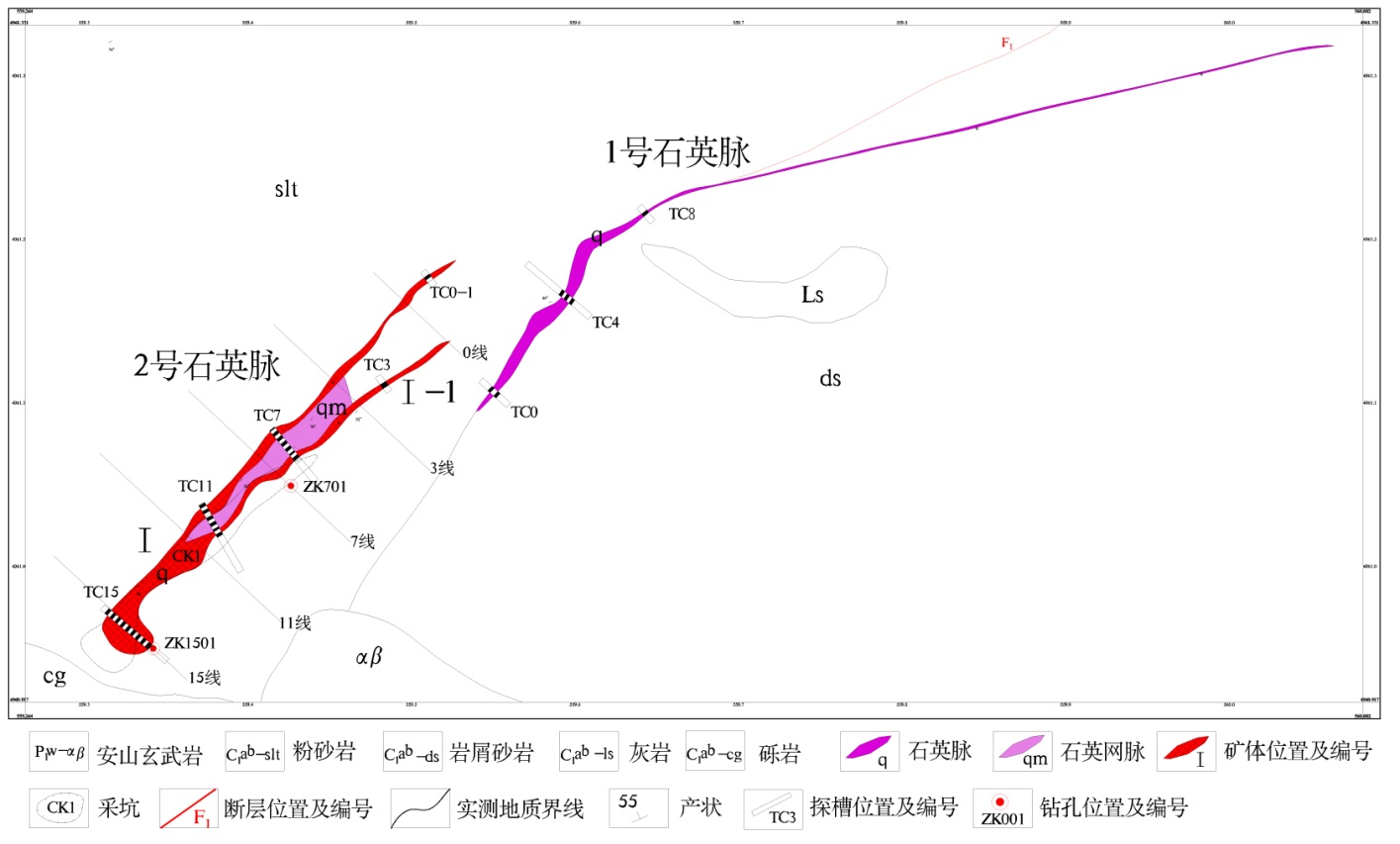 圈定了I號石英巖礦體、I號礦體分支Ⅰ-1號石英巖礦體和Qm石英網(wǎng)脈帶,礦體及石英網(wǎng)脈帶產(chǎn)于石炭系阿克沙克組上段(C1ab)的砂巖、粉砂巖中。礦體呈脈狀沿構(gòu)造裂隙充填,具分支現(xiàn)象,礦體中夾有石英網(wǎng)脈帶,連續(xù)性較好。