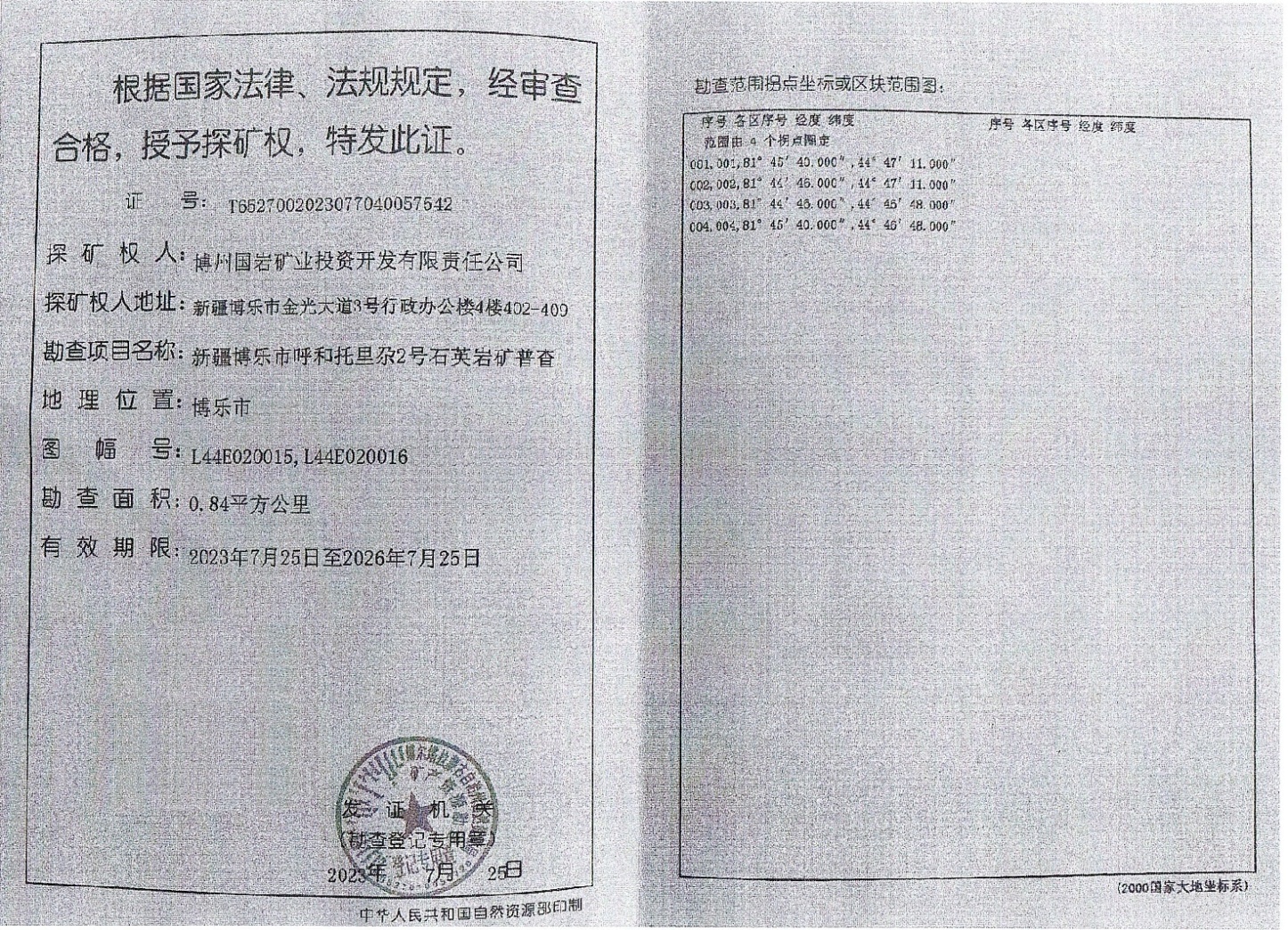 探礦權(quán)人:博州國巖礦業(yè)投資開發(fā)有限責(zé)任公司;