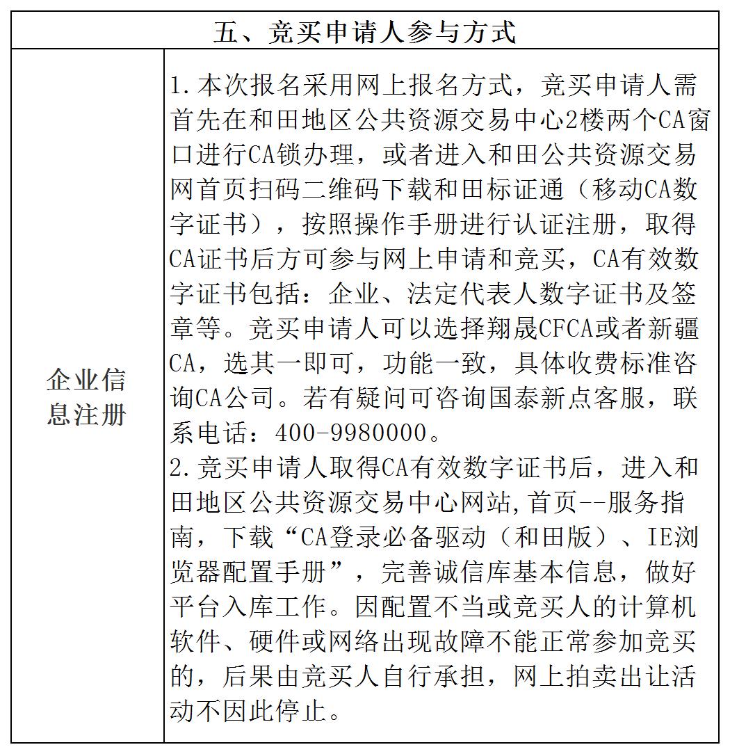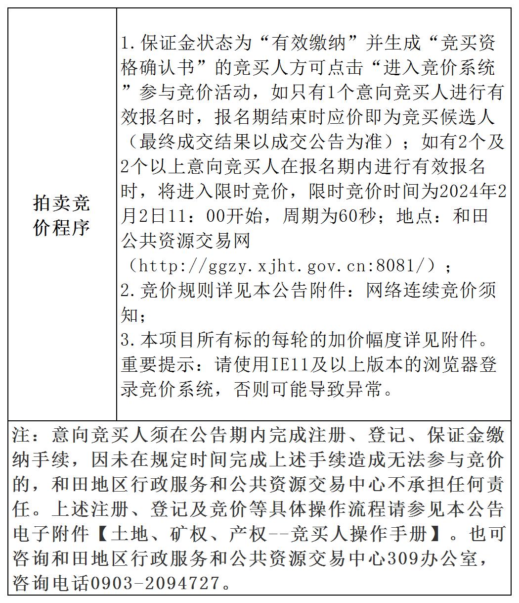 3.意向方進入競價系統(tǒng)進行應(yīng)(報)價,即視為接受和田地區(qū)行政服務(wù)和公共資源交易中心就本項目發(fā)布的公告(包括附件及變更公告)、【土地、礦權(quán)、產(chǎn)權(quán)--競買人操作手冊】及其他形式通知的全部內(nèi)容并無異議。