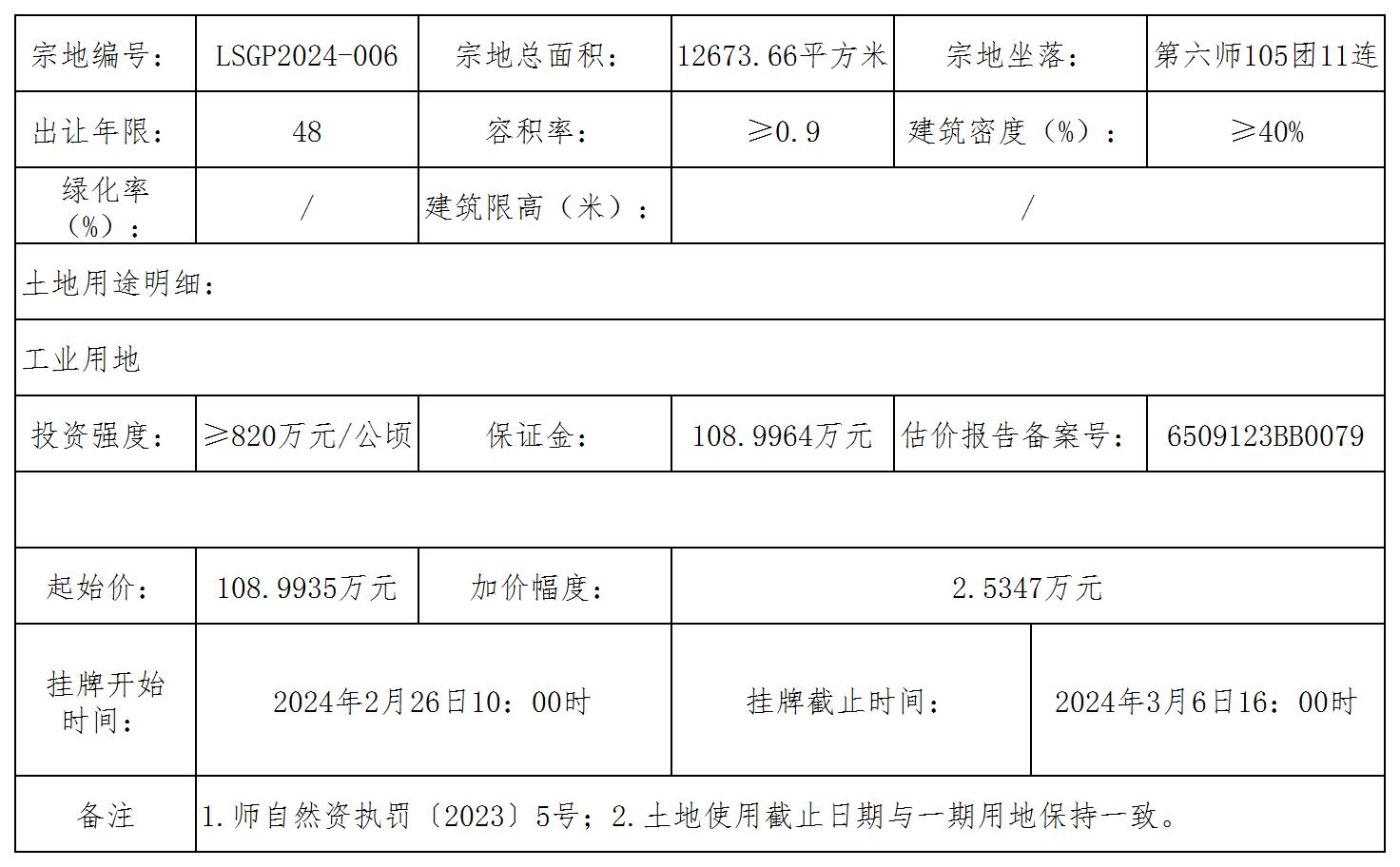 四、本次掛牌出讓的詳細資料和具體要求,見掛牌出讓文件。申請人可于2024年2月5日至2024年3月4日到兵團公共資源交易中心第六分中心獲取掛牌出讓文件。