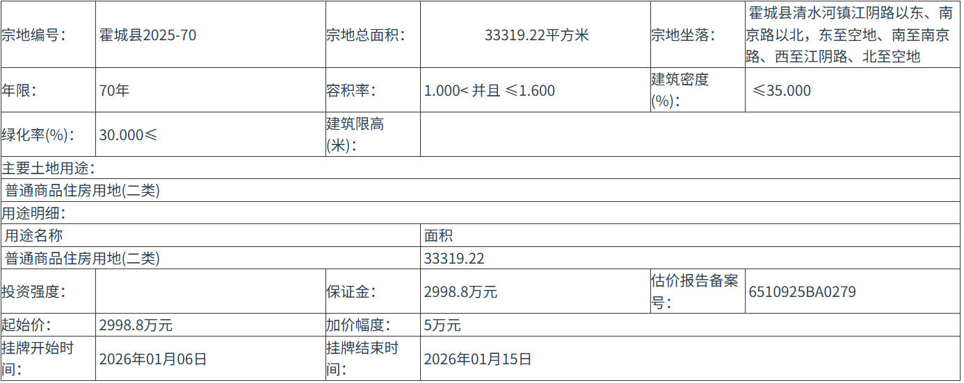霍城縣2025-70 號(hào)地塊:2026年01月06日 10時(shí)00分 至 2026年01月15日 12時(shí)00分;