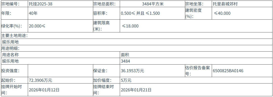 托掛2025-38 號(hào)地塊:2026年01月12日 12時(shí)00分 至 2026年01月21日 12時(shí)00分;