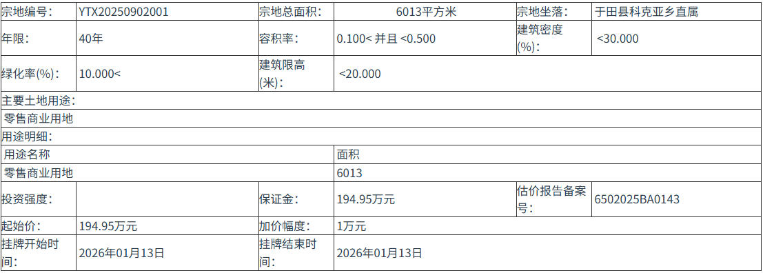 五、 申請人可于 2025年12月24日 至 2026年01月12日 到 和田地區(qū)公共資源交易中心 向我局提交書面申請。交納競買保證金的截止時間為2026年01月12日 12時00分 。經(jīng)審核,申請人按規(guī)定交納競買保證金,具備申請條件的,我局將在 2026年01月12日 20時00分 前確認其競買資格。