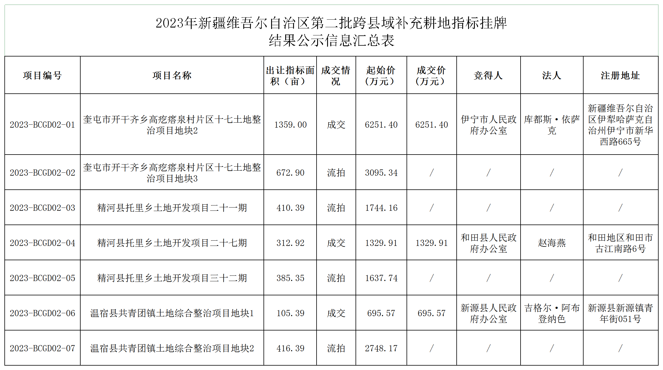 2023年12月20日,按照《2023年新疆維吾爾自治區(qū)第二批跨縣域補充耕地指標(biāo)掛牌交易公告》(2023-BCGD02),2023年自治區(qū)第二批跨縣域補充耕地指標(biāo)掛牌在新疆維吾爾自治區(qū)政務(wù)服務(wù)和公共資源交易中心以網(wǎng)上掛牌交易方式成交。根據(jù)有關(guān)規(guī)定,現(xiàn)對該指標(biāo)交易有關(guān)事項進行公示(具體內(nèi)容見附表)。