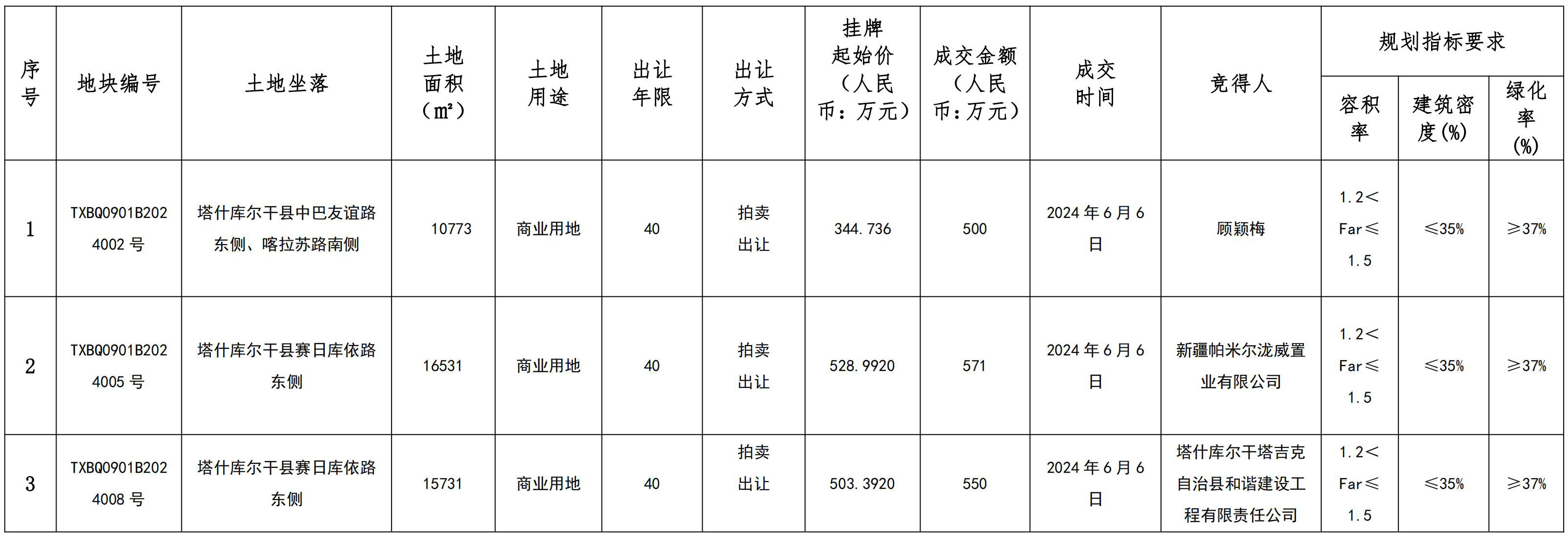塔什庫爾干塔吉克自治縣自然資源局國有建設(shè)用地使用權(quán)拍賣出讓成交結(jié)果公示