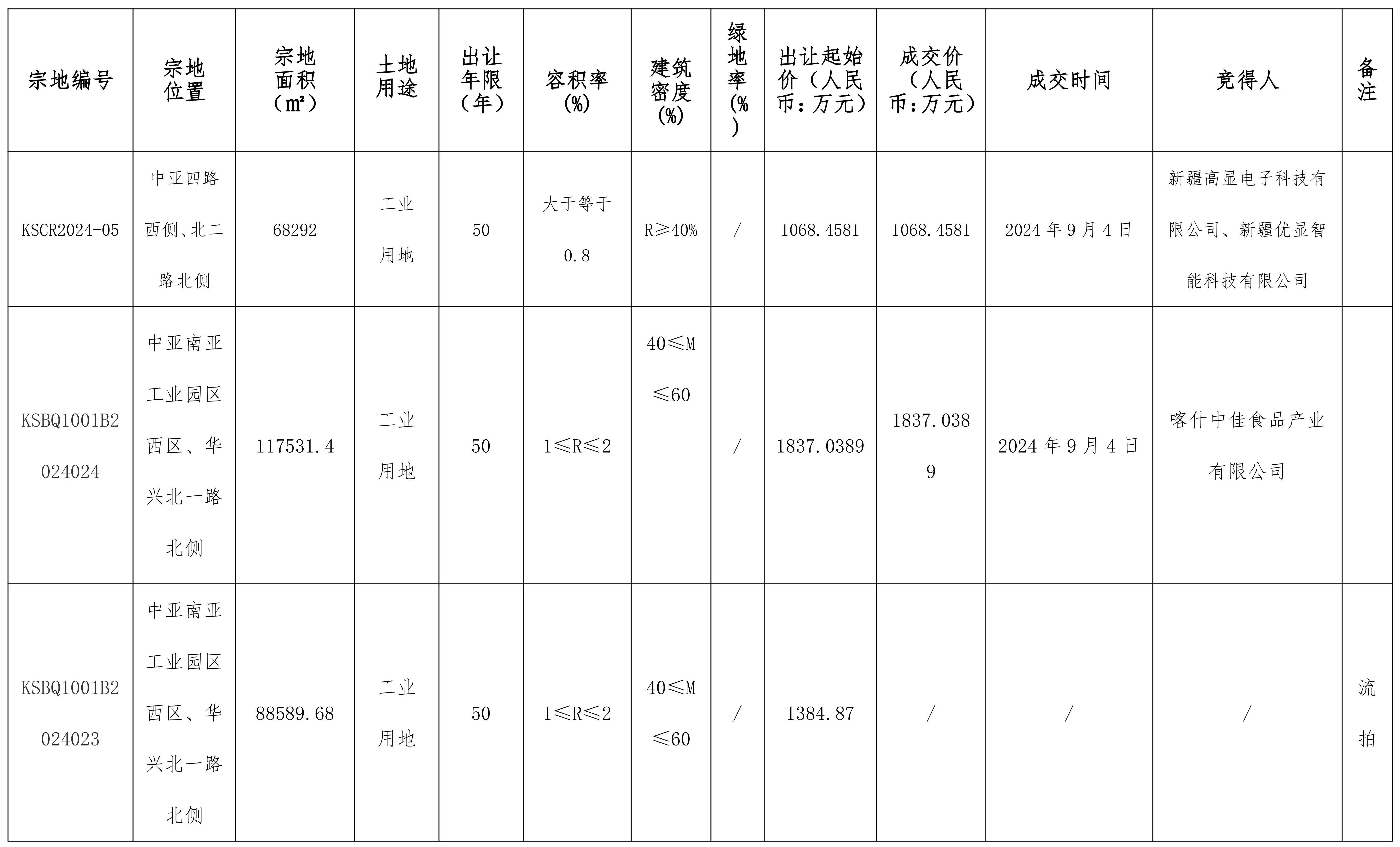根據(jù)《中華人民共和國土地管理法》《招標(biāo)拍賣掛牌出讓國有建設(shè)用地使用權(quán)規(guī)定》(國土資源部令第39號)《自治區(qū)深化公共資源交易平臺整合共享工作方案〉的通知》(新政辦函〔2019〕250號)等有關(guān)法律法規(guī)及文件的規(guī)定,喀什市自然資源局以掛牌方式出讓3(幅)地塊的國有建設(shè)用地使用權(quán),現(xiàn)將出讓成交結(jié)果公示如下: