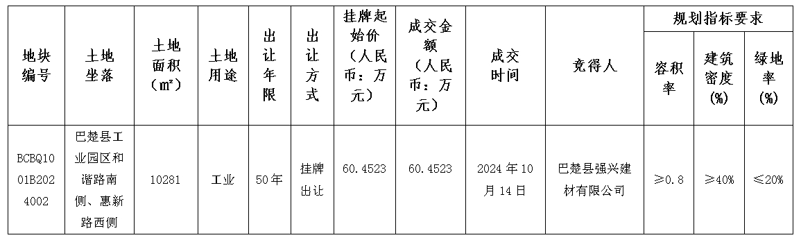 根據《中華人民共和國土地管理法》《招標拍賣掛牌出讓國有建設用地使用權規(guī)定》(國土資源部令第39號)《自治區(qū)深化公共資源交易平臺整合共享工作方案〉的通知》(新政辦函〔2019〕250號)等有關法律法規(guī)及文件的規(guī)定,巴楚縣自然資源局以掛牌方式出讓1(幅)地塊的國有建設用地使用權,現將出讓成交結果公示如下: