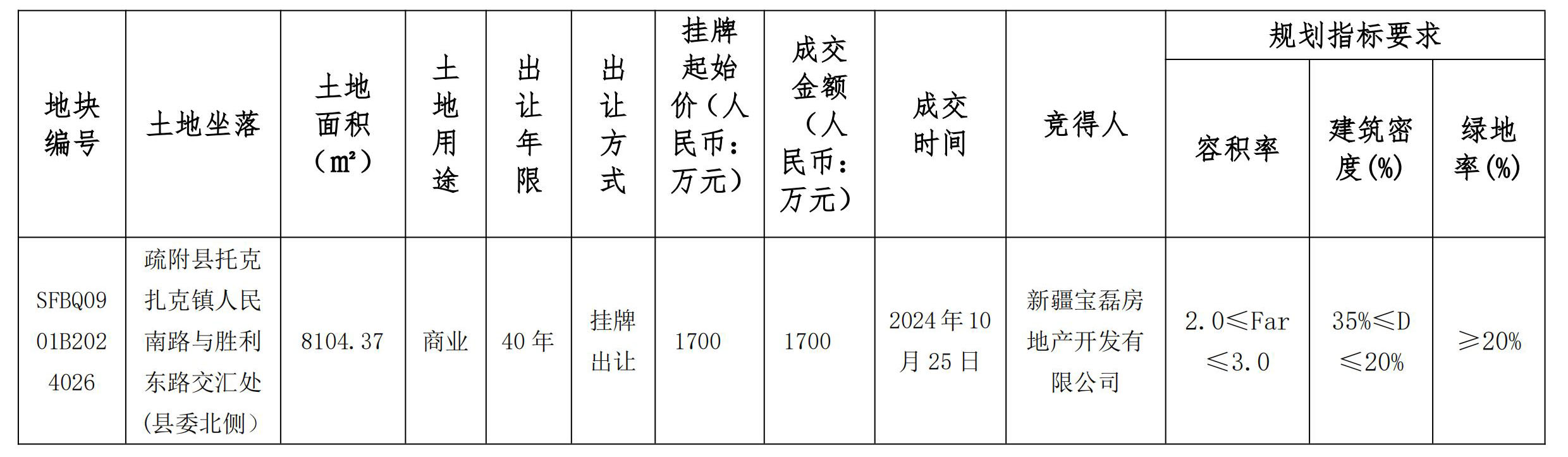 根據(jù)《中華人民共和國土地管理法》《招標(biāo)拍賣掛牌出讓國有建設(shè)用地使用權(quán)規(guī)定》(國土資源部令第39號(hào))《自治區(qū)深化公共資源交易平臺(tái)整合共享工作方案〉的通知》(新政辦函〔2019〕250號(hào))等有關(guān)法律法規(guī)及文件的規(guī)定,疏附縣自然資源局以掛牌方式出讓1(幅)地塊的國有建設(shè)用地使用權(quán),現(xiàn)將出讓成交結(jié)果公示如下: