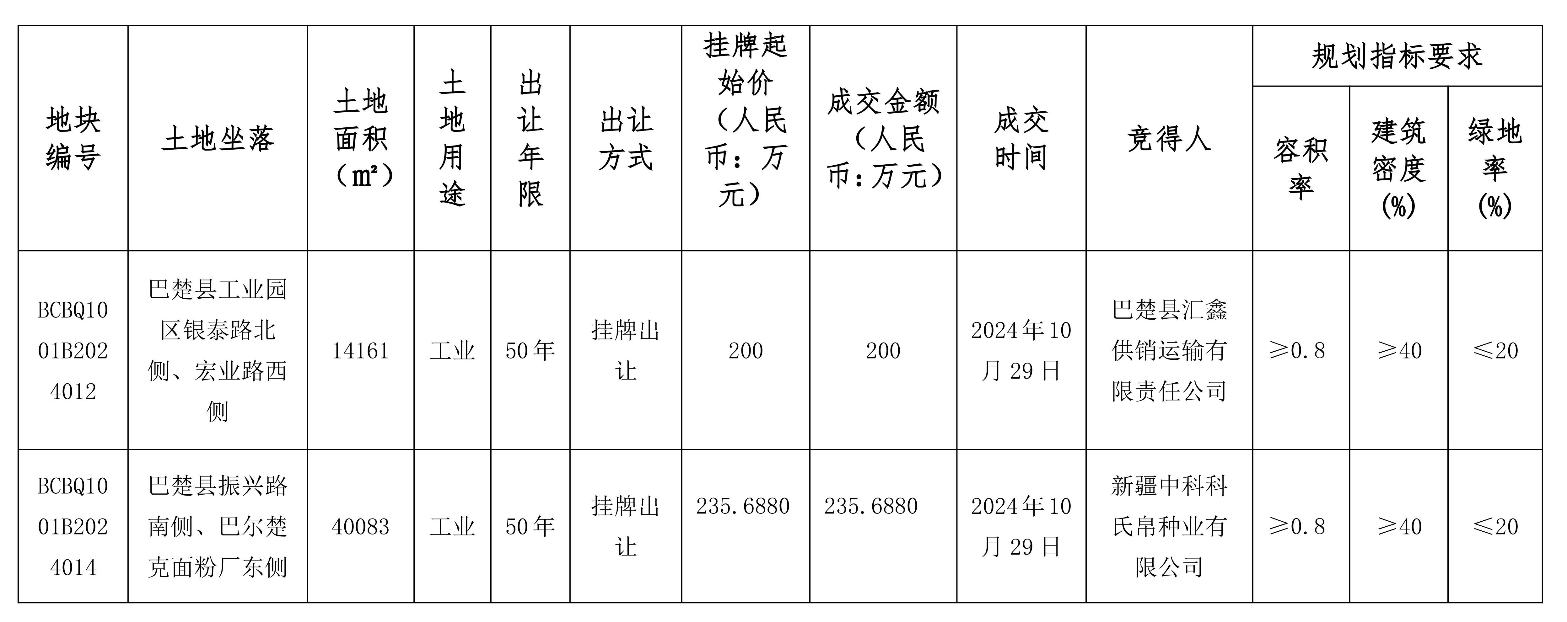 根據(jù)《中華人民共和國(guó)土地管理法》《招標(biāo)拍賣掛牌出讓國(guó)有建設(shè)用地使用權(quán)規(guī)定》(國(guó)土資源部令第39號(hào))《自治區(qū)深化公共資源交易平臺(tái)整合共享工作方案的通知》(新政辦函〔2019〕250號(hào))等有關(guān)法律法規(guī)及文件的規(guī)定,巴楚縣自然資源局以掛牌方式出讓2(幅)地塊的國(guó)有建設(shè)用地使用權(quán),現(xiàn)將出讓成交結(jié)果公示如下: