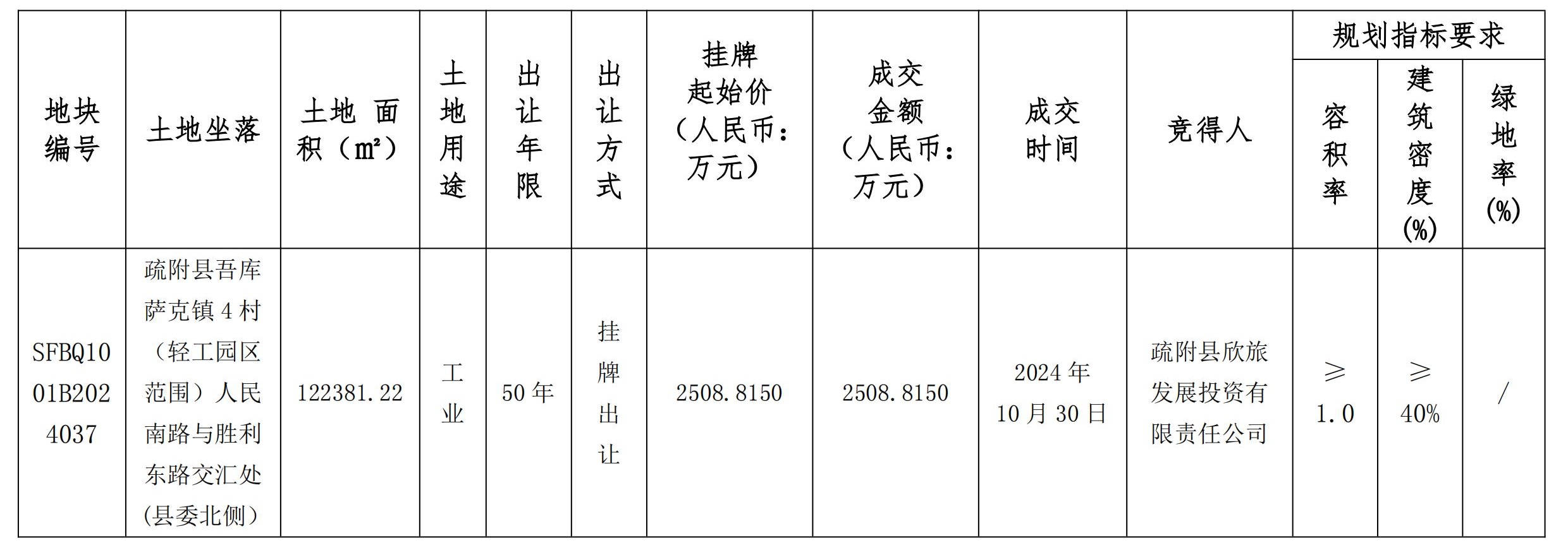 根據(jù)《中華人民共和國土地管理法》《招標(biāo)拍賣掛牌出讓國有建設(shè)用地使用權(quán)規(guī)定》(國土資源部令第39號)《自治區(qū)深化公共資源交易平臺(tái)整合共享工作方案〉的通知》(新政辦函〔2019〕250號)等有關(guān)法律法規(guī)及文件的規(guī)定,疏附縣自然資源局以掛牌方式出讓1(幅)地塊的國有建設(shè)用地使用權(quán),現(xiàn)將出讓成交結(jié)果公示如下: