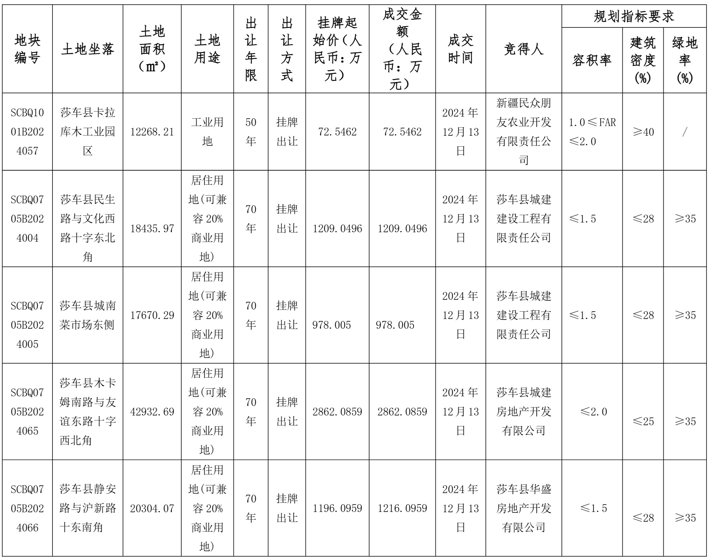 根據《中華人民共和國土地管理法》《招標拍賣掛牌出讓國有建設用地使用權規(guī)定》、(國土資源部令第39號)自治區(qū)人民政府辦公廳轉發(fā)自治區(qū)發(fā)展改革委《自治區(qū)深化公共資源交易平臺整合共享工作方案的通知》(新政辦函〔2019〕250號)等有關法律法規(guī)及文件的規(guī)定,莎車縣自然資源局以掛牌方式出讓5(幅)地塊的國有建設用地使用權,現將出讓成交結果公示如下: