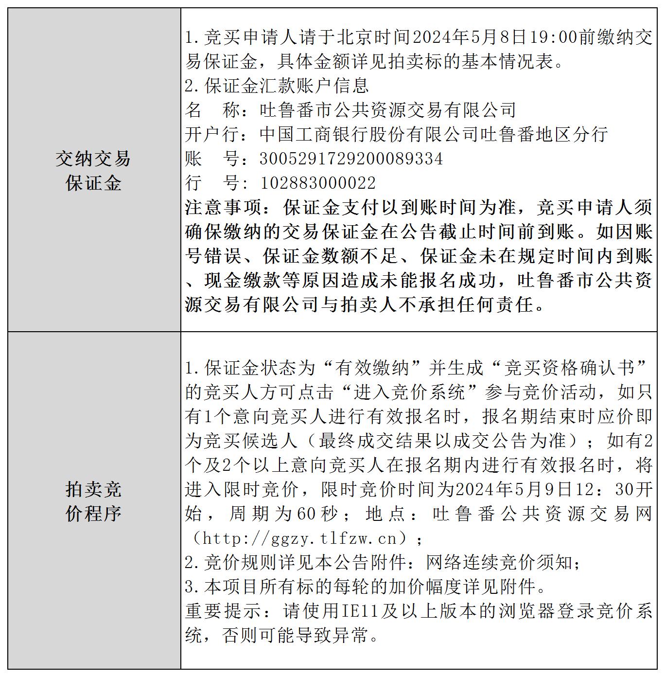 (1)公告發(fā)出后即進(jìn)入公告報(bào)名期。報(bào)名期結(jié)束后,進(jìn)入限時(shí)競(jìng)價(jià)期。本項(xiàng)目限時(shí)競(jìng)價(jià)周期為60秒。限時(shí)競(jìng)價(jià)期內(nèi)如無(wú)人加價(jià),則限時(shí)報(bào)價(jià)期最高出價(jià)者即為成交人,該標(biāo)的競(jìng)價(jià)活動(dòng)結(jié)束;限時(shí)競(jìng)價(jià)周期內(nèi)如出現(xiàn)有效應(yīng)(報(bào))價(jià),則進(jìn)入新的限時(shí)競(jìng)價(jià)周期;在一個(gè)限時(shí)競(jìng)價(jià)周期內(nèi)如未出現(xiàn)有效應(yīng)(報(bào))價(jià),則應(yīng)(報(bào))價(jià)結(jié)束,當(dāng)前最高有效應(yīng)(報(bào))價(jià)者即成為成交人,該標(biāo)的競(jìng)價(jià)活動(dòng)結(jié)束。
