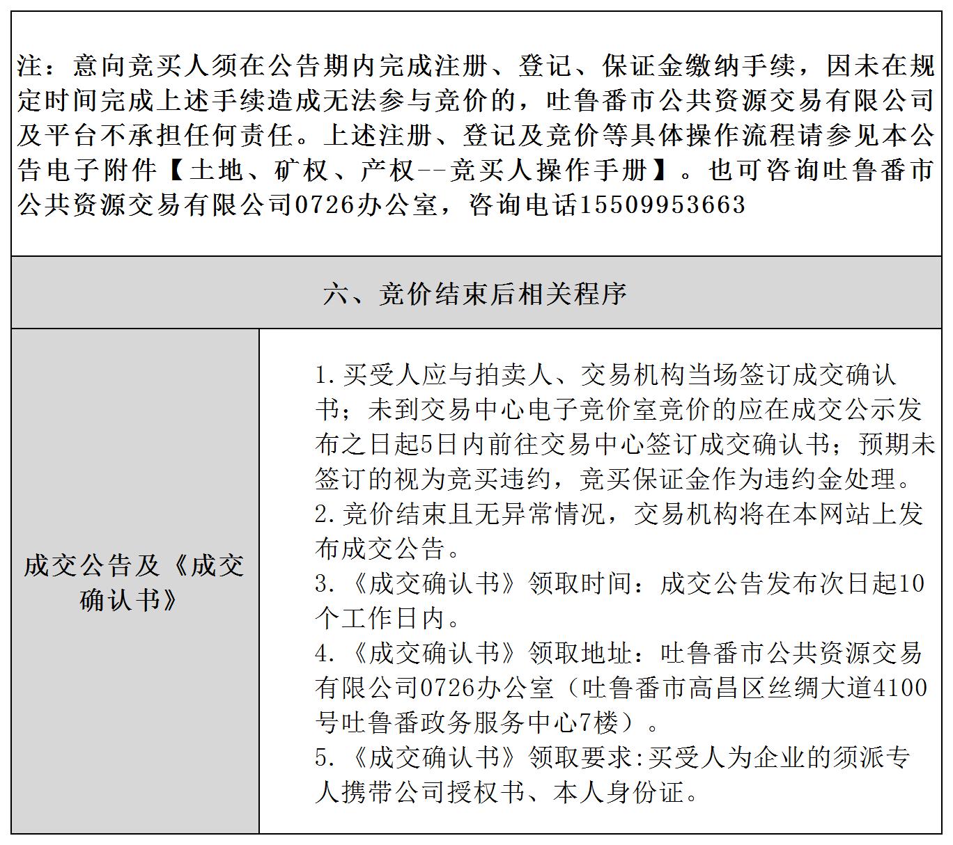 3.意向方進(jìn)入競(jìng)價(jià)系統(tǒng)進(jìn)行應(yīng)(報(bào))價(jià),即視為接受吐魯番市公共資源交易有限公司就本項(xiàng)目發(fā)布的公告(包括附件及變更公告)、【土地、礦權(quán)、產(chǎn)權(quán)--競(jìng)買人操作手冊(cè)】及其他形式通知的全部?jī)?nèi)容并無(wú)異議。