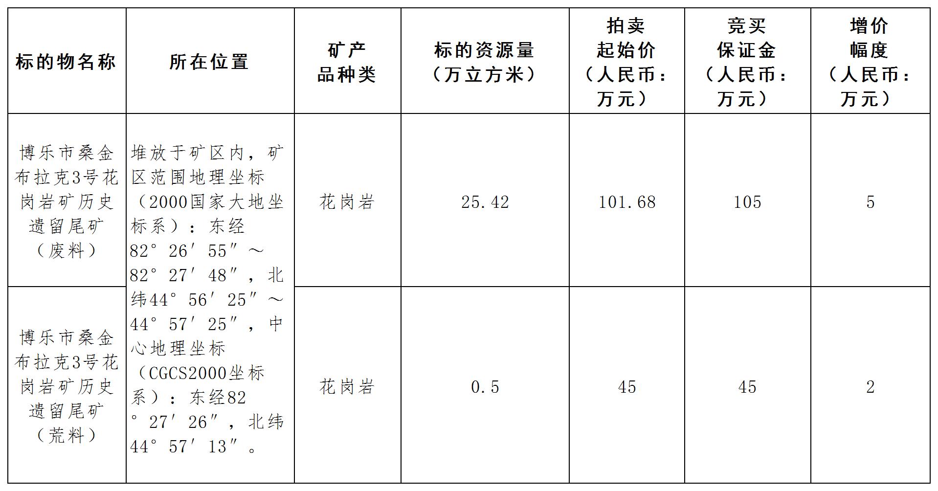 根據(jù)《中華人民共和國(guó)拍賣法》《企業(yè)國(guó)有資產(chǎn)交易監(jiān)督管理辦法》(財(cái)政部令第 32 號(hào))、《新疆維吾爾自治區(qū)行政事業(yè)單位國(guó)有資產(chǎn)處置管理辦法》(新財(cái)規(guī)[2023]3號(hào))等有關(guān)規(guī)定,礦業(yè)權(quán)人博州國(guó)巖礦業(yè)投資開發(fā)有限責(zé)任公司全權(quán)委托新疆國(guó)源土地礦產(chǎn)資源交易中心公開交易。由新疆公信拍賣有限公司對(duì)新疆博樂(lè)市桑金布拉克3號(hào)花崗巖礦歷史遺留尾礦廢料、荒料進(jìn)行公開拍賣,現(xiàn)將有關(guān)事項(xiàng)公告如下: