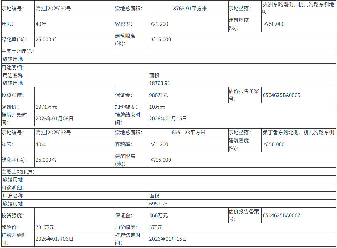 高掛[2025]33號 號地塊:2026年01月06日 10時00分 至 2026年01月15日 16時00分;