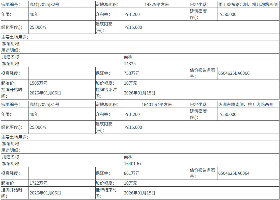 高掛[2025]31號 號地塊:2026年01月06日 10時00分 至 2026年01月15日 16時00分;