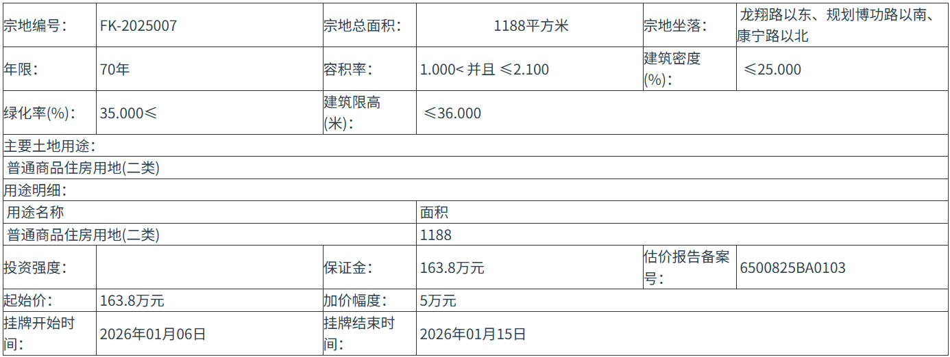 FK-2025007 號地塊:2026年01月06日 10時00分 至 2026年01月15日 18時00分;